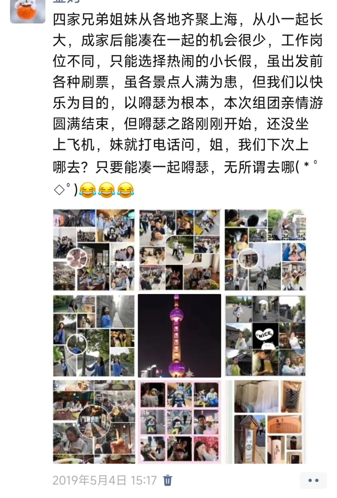 别说六位人了,我们几个兄弟姐妹自从19年一起去了上海也再没有同行过。那年,俺妹是队长,负责攻略,其余人全程不发表意见,盲从,一路上和谐的很,吃啥去哪玩,谁都没有反对意见,主打一个开心快乐!返程时,俺妹问:姐,下次上哪去?我说:只要能一起得瑟,无所谓去哪!返程路上,发了一条朋友圈。
