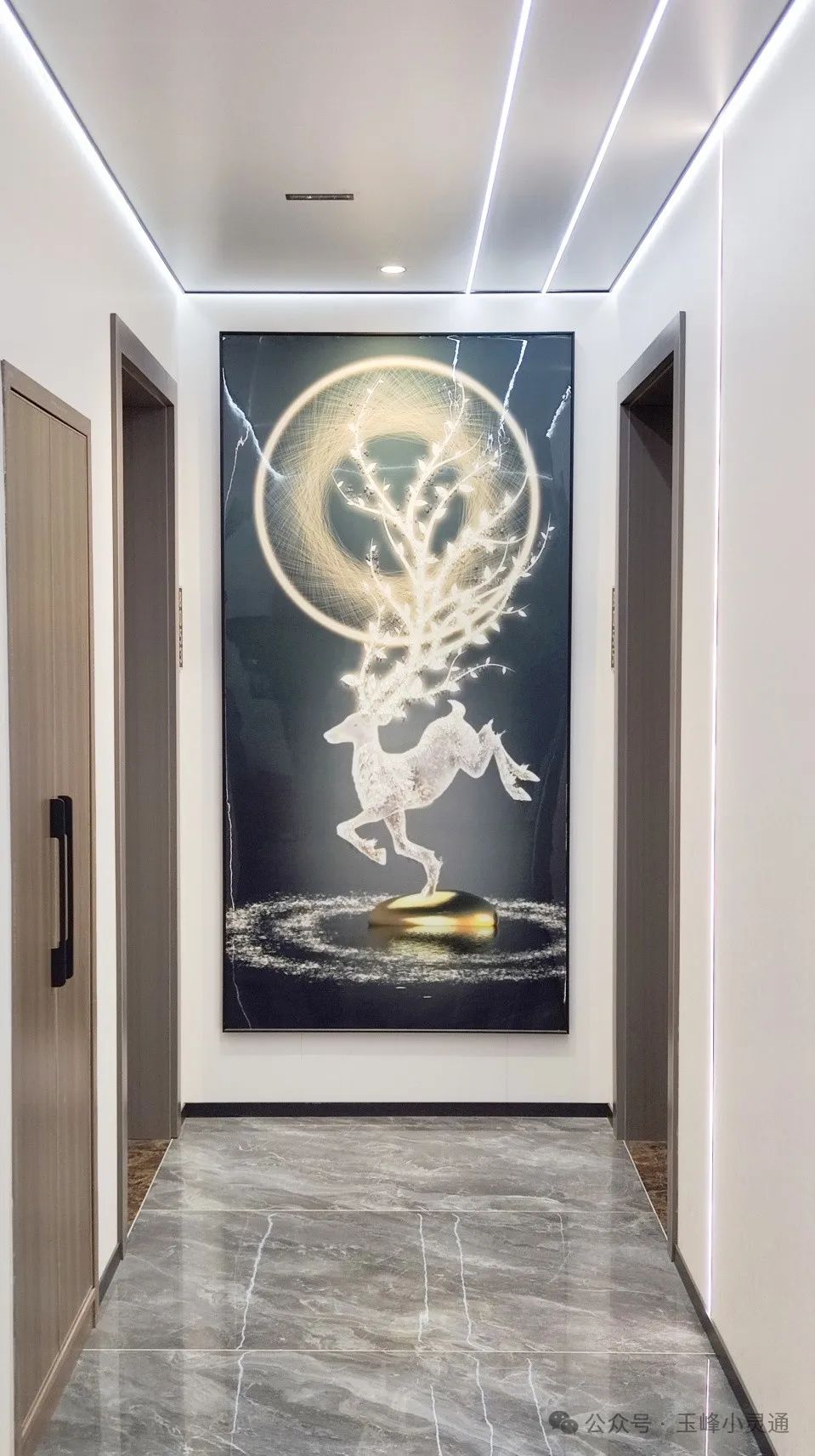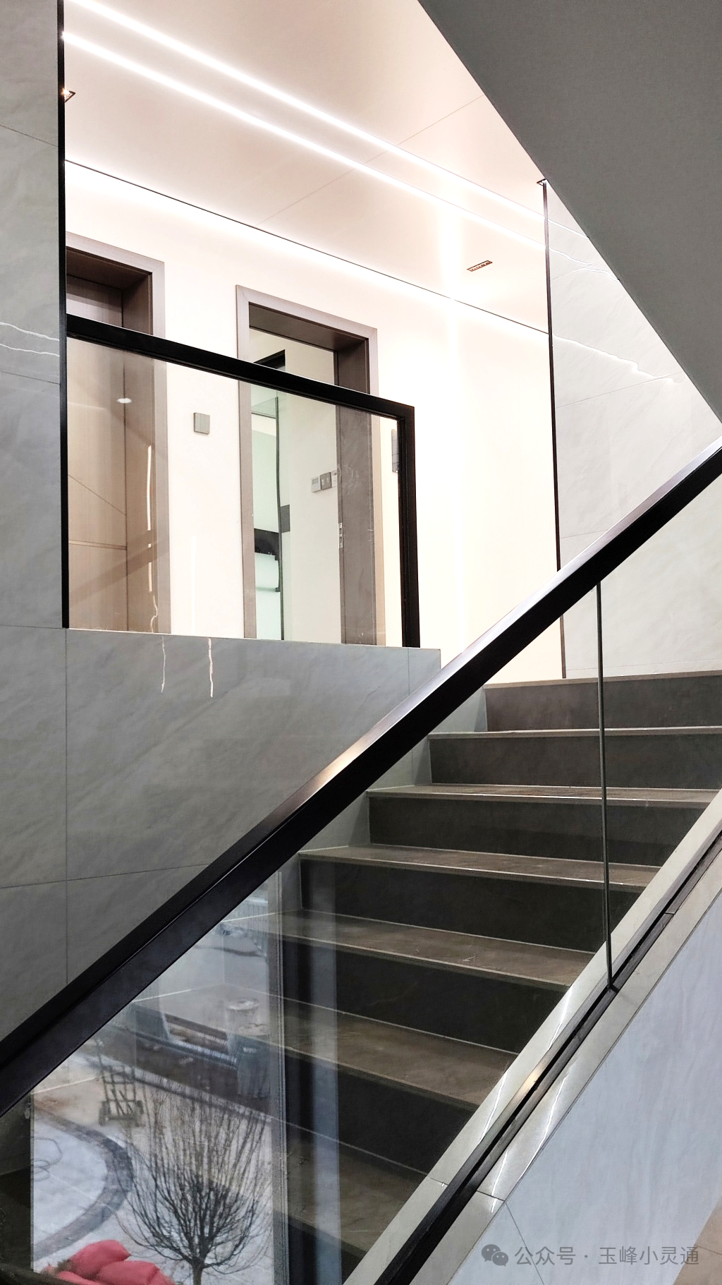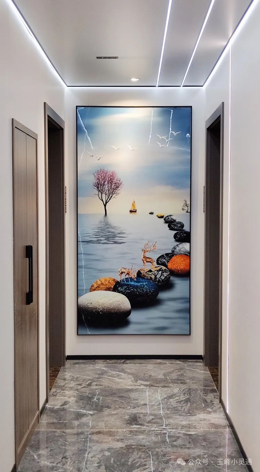 宽敞气派的楼梯和电梯、立在走廊尽头的艺术画框、装修精致的茶室、