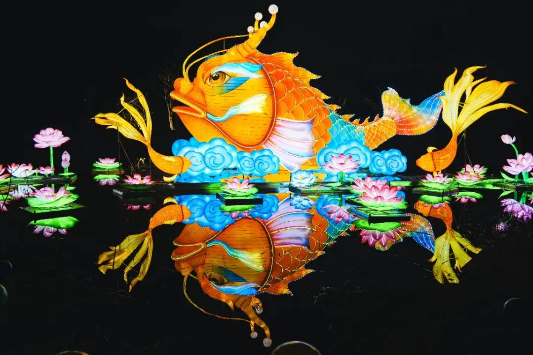 整趟灯会逛下来,只能用全程震撼形容。20米高巨型醒狮灯、百米水上 “万马奔腾” 灯组、11米高 “大吉大利” 灯……85组华灯流光溢彩宛若星河倾泻。你可以穿越回古代,当一回海商;也可以在诗词里漫步;或者到360°球幕剧场躺着看大片。
