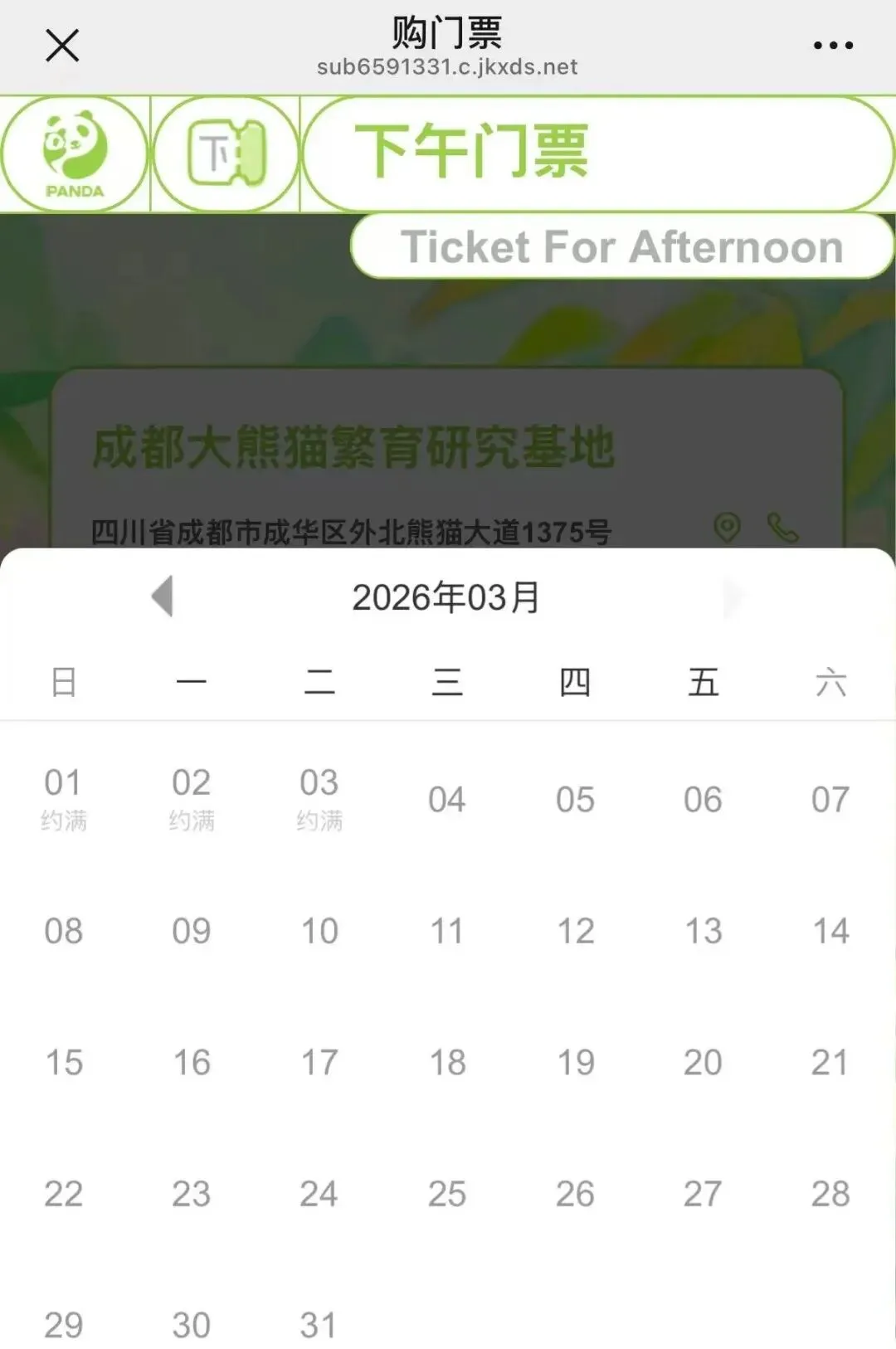 小布搜索成都大熊猫繁育研究基地购票小程序发现,2月18日、2月19日,3月1日-3月3日上午门票已约满。