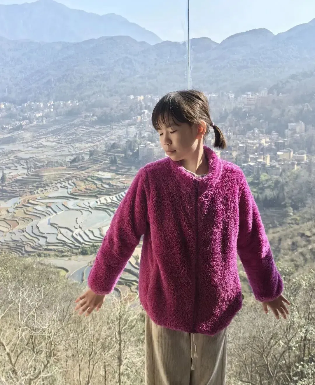 民宿楼梯间的玻璃窗很宽敞,透过窗户能看到大片梯田,视野很好,算是不错的观光点。如果多依树观景台的门票值76元,这个窗户观景台的门票也值50元。