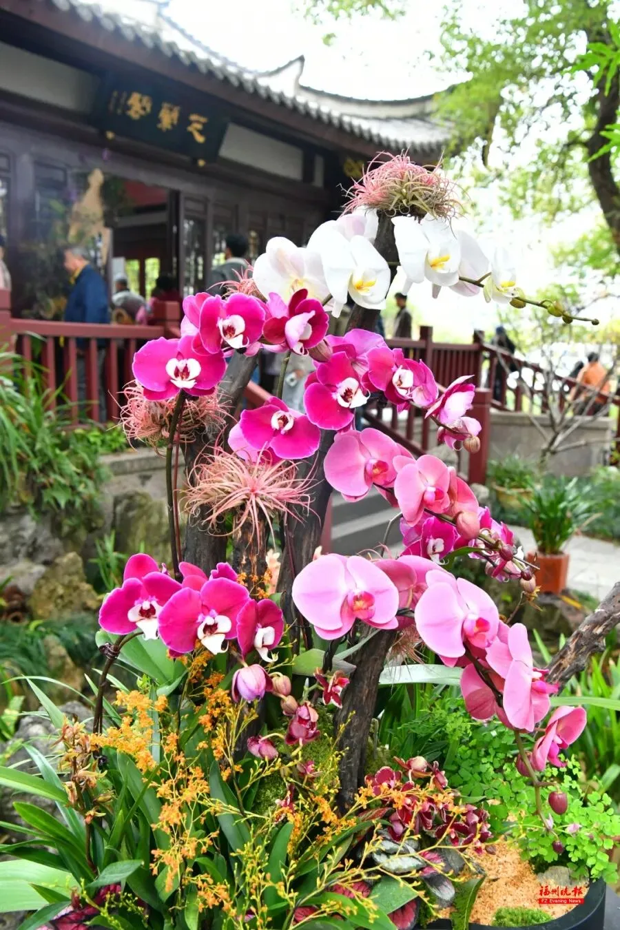 展区同步展出兰花书法字画32幅、景观小品11组、组合盆栽44组,搭配雾森系统与古建光影,让兰花之美与闽都人文底蕴相融相生。