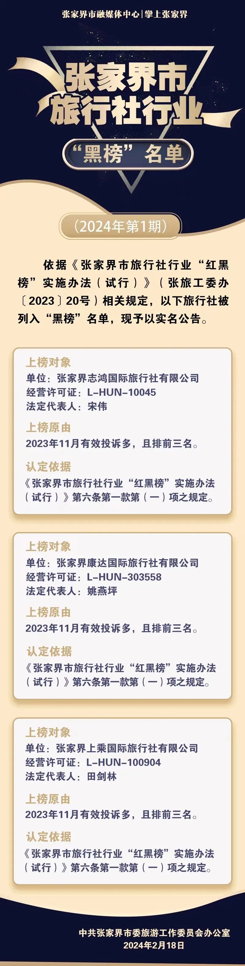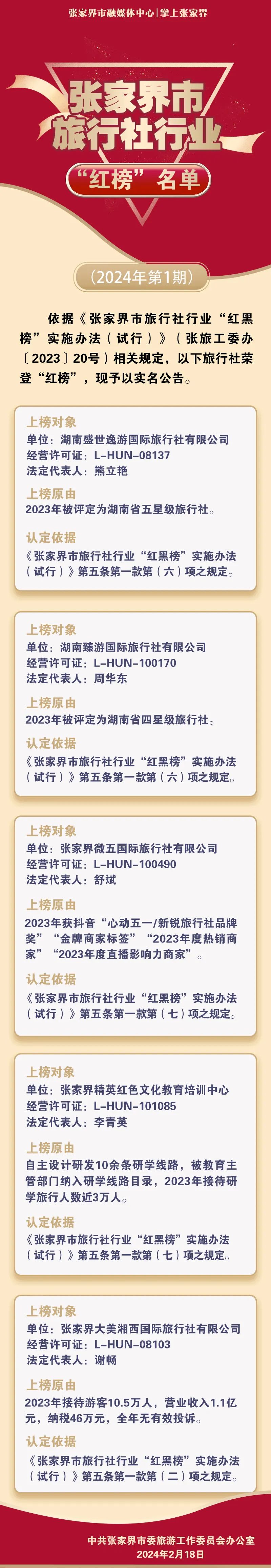 您现在的位置是:首页 > 国内旅游目的推荐 > 正文 国内旅游目的推荐 张家界某旅行社全年营业额1.1亿!旅行社行业“红榜”“黑榜”名单曝光 admin2024年02月20日 01:15:52国内旅游目的推荐128 张家界市旅行社行业“黑榜”名单(2024年第1期)二张家界市旅行社行业“红榜”名单(2024年第1期)来源:掌上张家界小编是有底线的免责声明:本内容不代表平台观点,如有各项侵犯权益,请联系小编删除处理.合作热线:19574482348洪秘书长了解更多张家界市信息点击下方关注“张家界活动网”微信公众号 转载请说明来源于"旅荐网",部分内容转载自网络,如有侵权请联系qlwl@foxmail.com删除 本文地址:https://www.15386.cn/post/11270.html 上一篇 项目简介丨“桃花源”乡村旅游新平台 下一篇 “机票1万,酒店28万”:海南凭一己之力,把无数伪中产打回原形 相关文章 周末周边行,央视热播剧取景!老友记们的游玩攻略来了! 《“十五五”文化和旅游发展规划》四大编制使命 新能源车出游指南:老司机的10个实用建议 腾冲四季旅行攻略:本地人带你玩转极边第一城 2026年春节去大理旅游地图路线攻略看过来 山西晋城五天四晚小众路线旅游攻略 旅行攻略 | 赴一场春日的幸运之约(文末含兑换码) 腾冲四季旅行攻略:本地人带你玩转极边第一城 3-5\7️福建旅游攻略已做好!姐妹们码住 越南清化省海进海滩超详细旅行攻略 发表评论 取消回复 评论列表 这篇文章还没有收到评论,赶紧来抢沙发吧~
