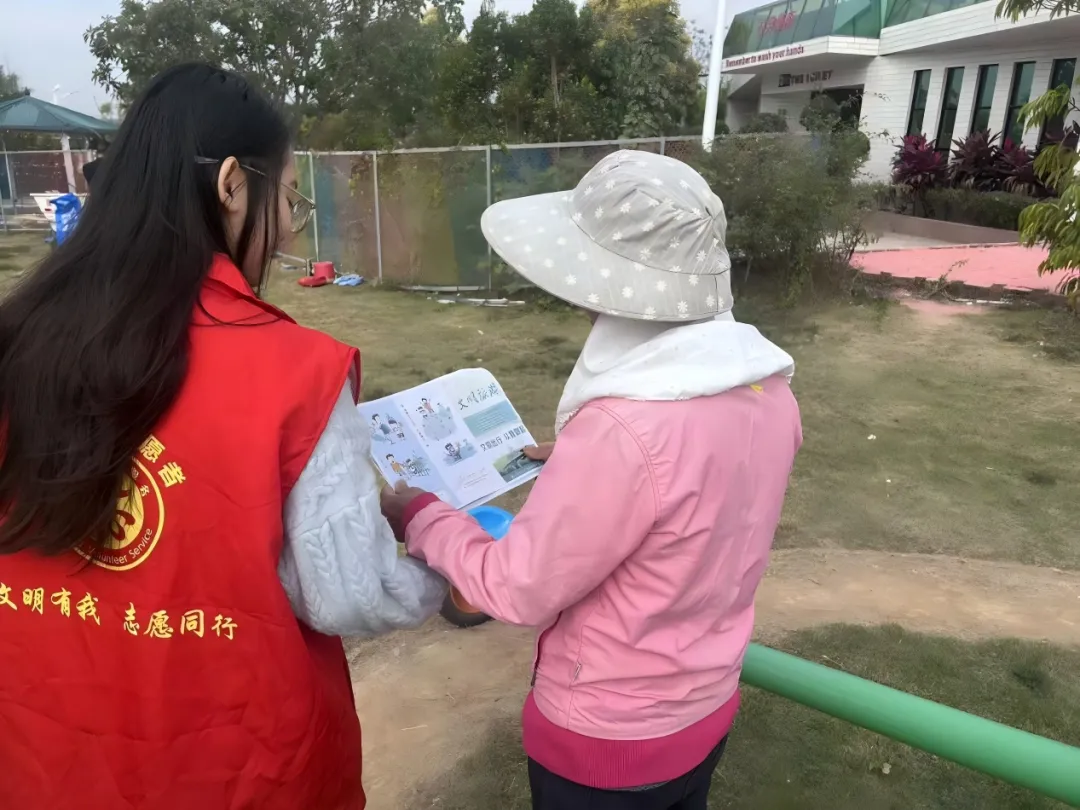 志愿者在鳄鱼生态公园向游客派发文明旅游宣传手册
