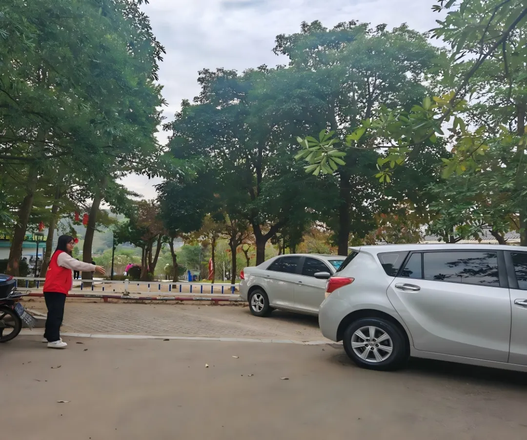 志愿者在塘山岭风景区引导游客规范泊车