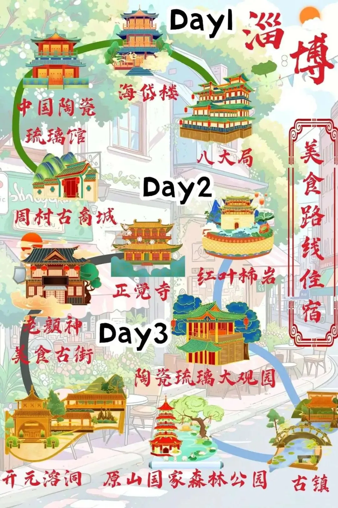 D1:八大局便民.市场(.早.餐)→. 中国陶瓷.琉璃馆. → 海岱楼钟书阁. →. 水晶.街(夜宵烧烤)