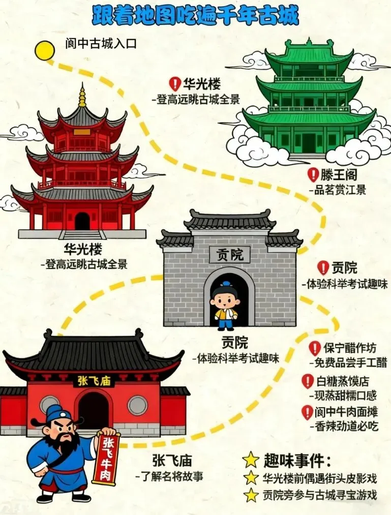 D1.:阆中古城(汉桓侯.祠、贡院、中天.楼)→ .嘉陵江游船 → 看皮影.戏