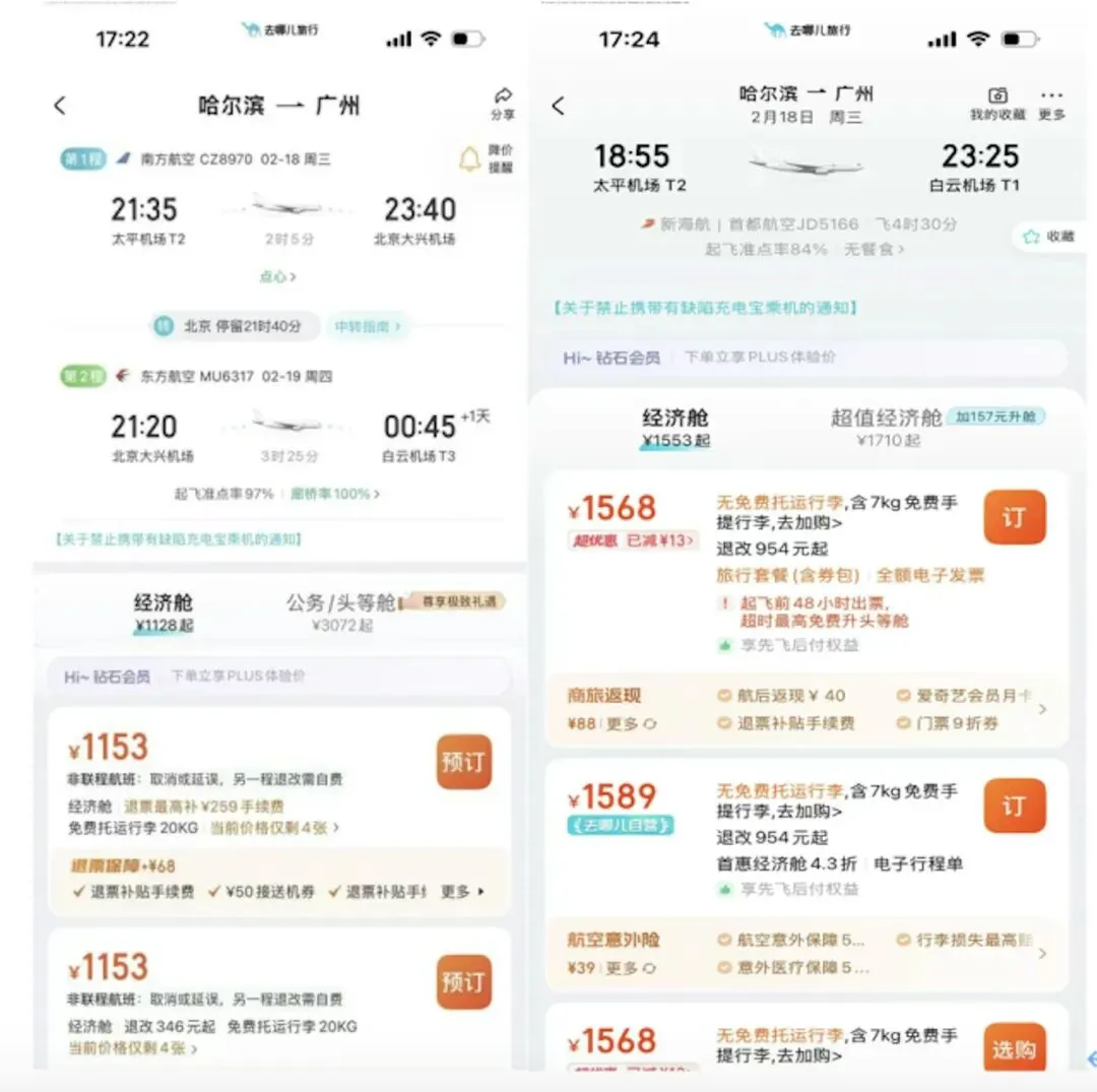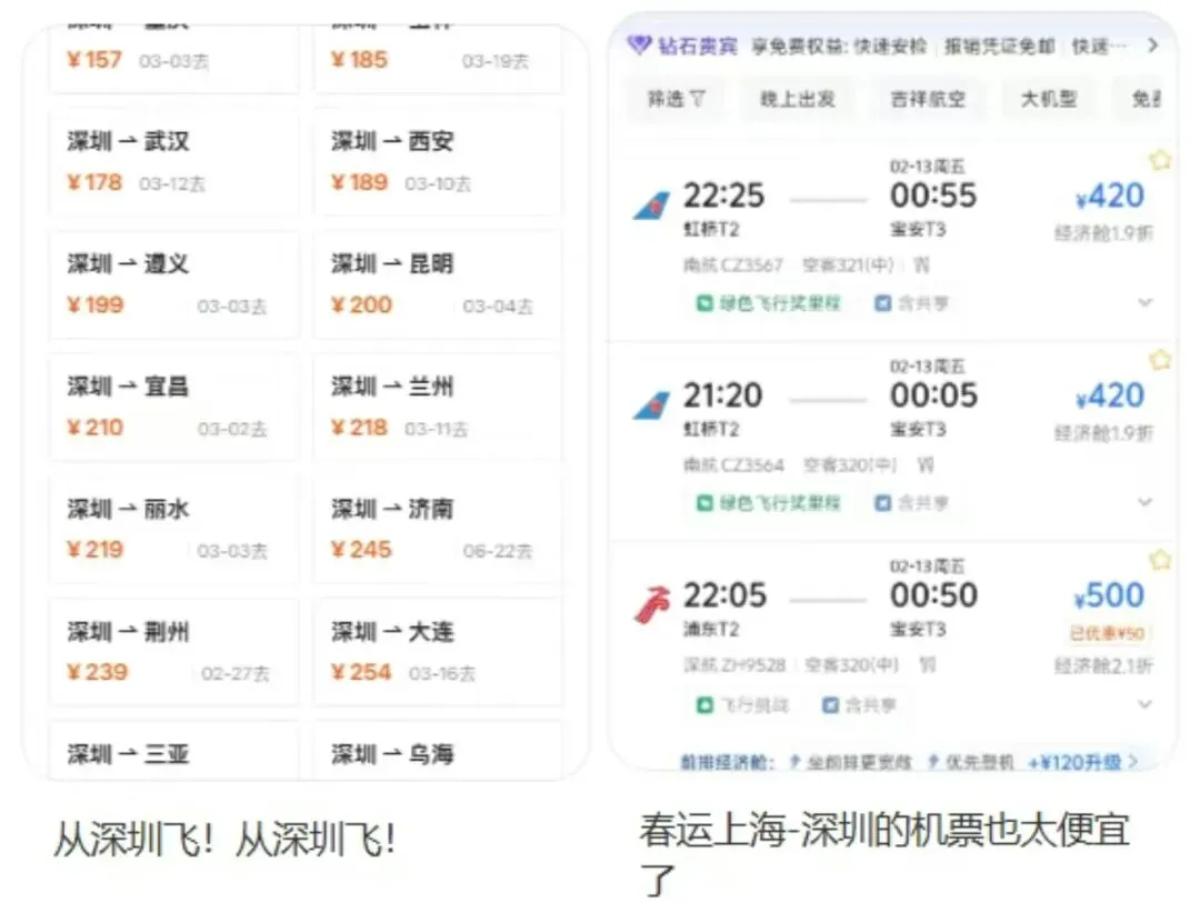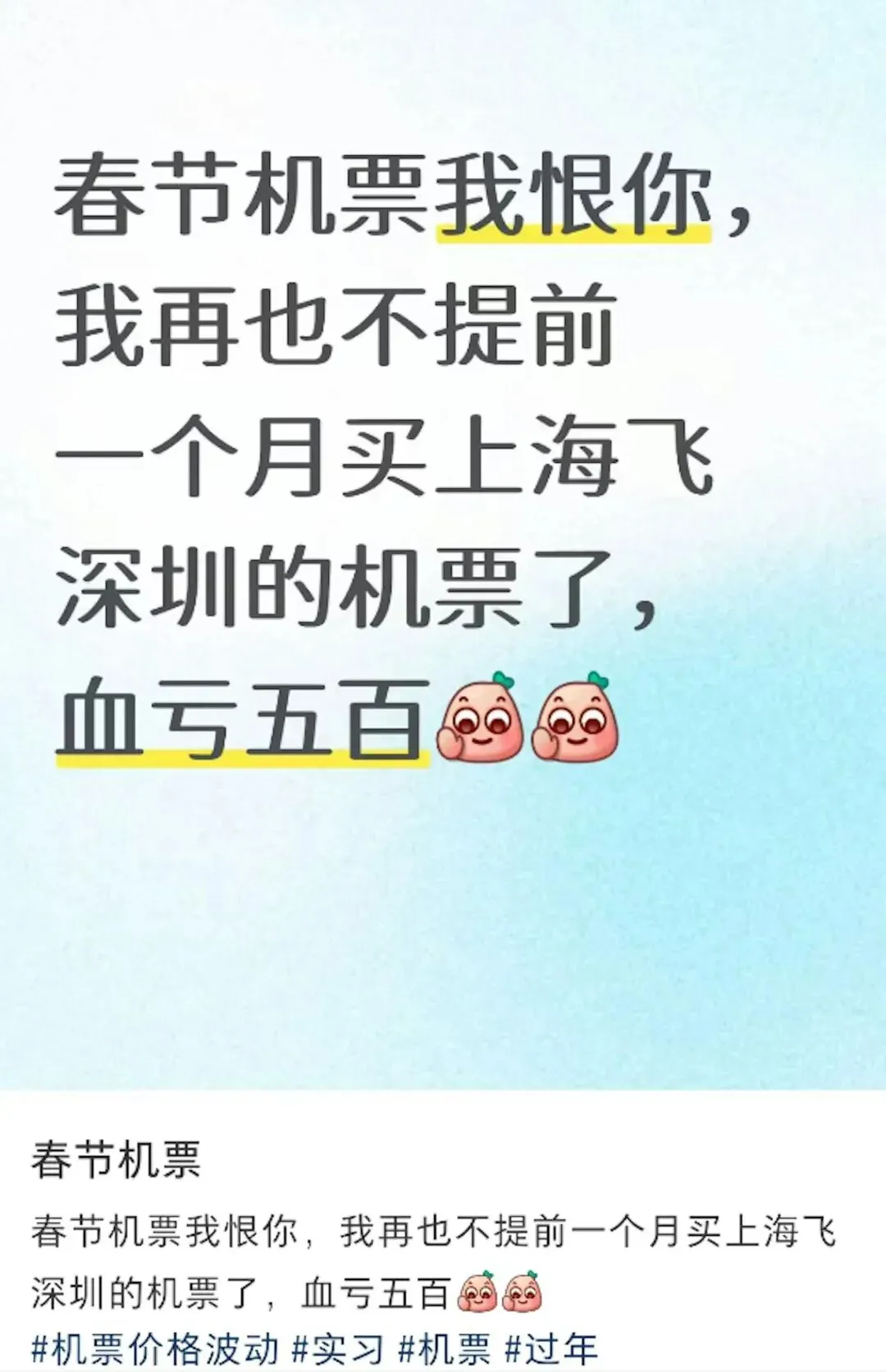 機票價格方面,不少網民感嘆今年春節機票太便宜。有人在社交媒體上曬出截圖,表示「機票買早了,血虧五百」,引來不少共鳴,有網民留言說「一家四口虧了4000元(人民幣,下同)」。然而,亦有人預判了機票降價,成功「抄底」低價票。