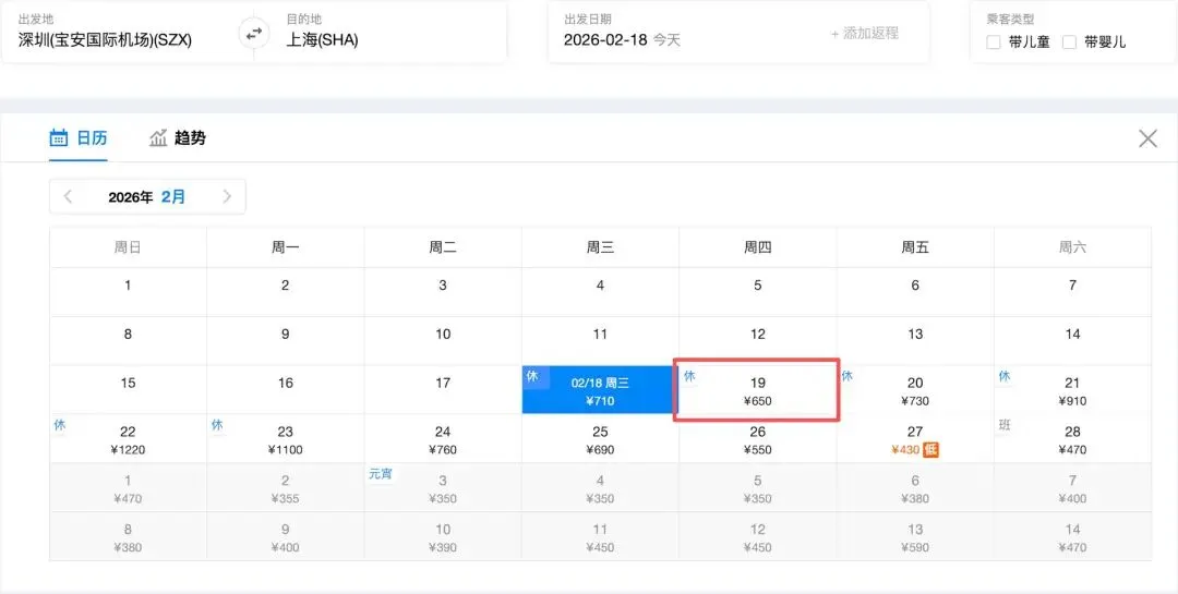 馬年春節內地迎來「史上最長」假期,今日(18日)大年初二,假期進入第四天。由於今年除夕前一天便開始放假,不少人除夕過後立即由「走親戚模式」切換為「旅行模式」,開啟春節第二段飛行。多個旅遊平台數據顯示,初一至初三乘飛機出遊人群明顯增加,初一出發的機票預訂量甚至超過節前高峰,而不少熱門航線價格較節前已「腰斬」,部份機票比高鐵票更便宜,吸引旅客「抄底」出行。