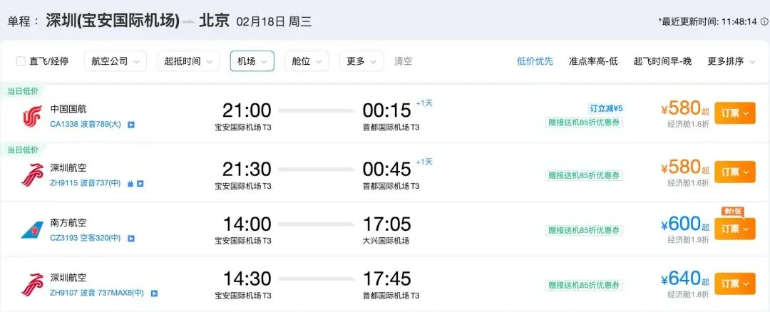 2月18日,記者在出行軟件上搜索深圳至北京機票,最低價顯示為580元,部份機票低至1.6折;深圳至上海機票近日最低價為650元,而深圳北至上海虹橋動車票售價約638至705元。