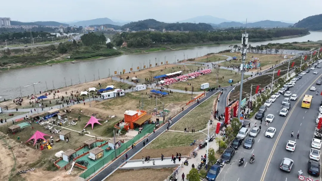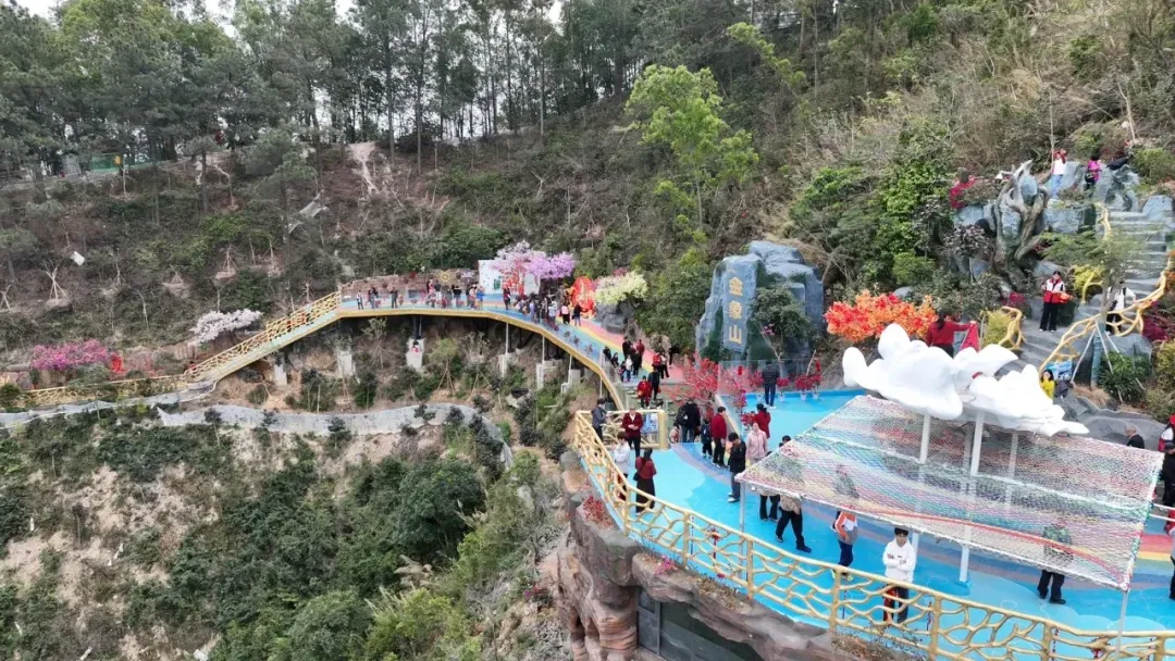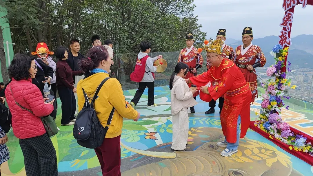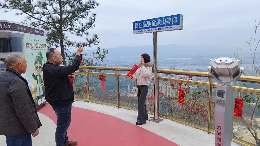 沿着修葺一新的步道登山,沿途悬挂的红灯笼与祈福带随风摇曳,处处洋溢着喜庆氛围。在山顶观景台,游客们争相与“财神爷”合影,领取寓意吉祥的“利是”。从广州回乡过年的黄女士兴奋地说,新年来登金象山既能锻炼身体,又能为新年讨个好彩头,这样的春节活动很有意义。站在爱心情侣观景平台上,新兴江与高要城区尽收眼底,山水相依的画卷让游客流连忘返。