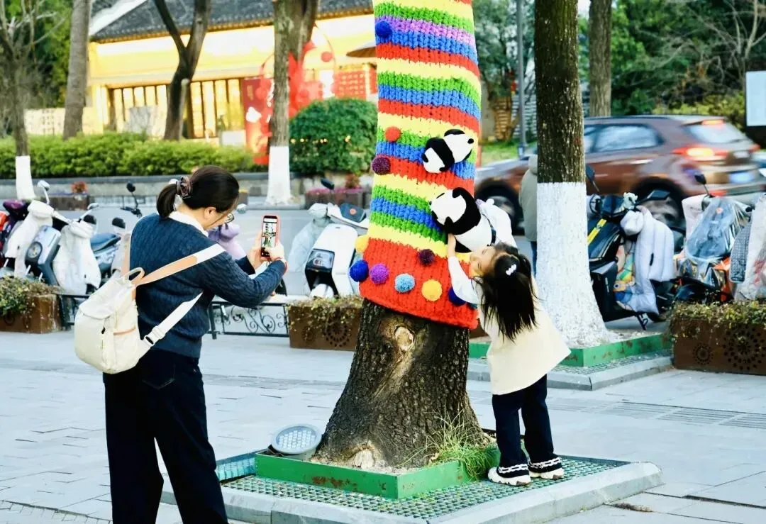 除了热闹的巡游,街区精心打造的 “坊间流光”主题美陈,也成为今日游客们争相打卡的焦点。无论是寓意财源滚滚的 “财神附体”美陈,还是自然古朴、融合非遗编织之美的竹编树,或是为冬日增添融融暖意的“毛衣树”与“围巾树”,每一处都细节满满,年味十足。在“毛衣树”前,带着一家人来逛的市民张阿姨拉着老伴拍照,她笑着说:“你看这树还穿上了‘毛衣’,多可爱啊!感觉不到冬天的冷了,我们扬州就是细巧讲究。”