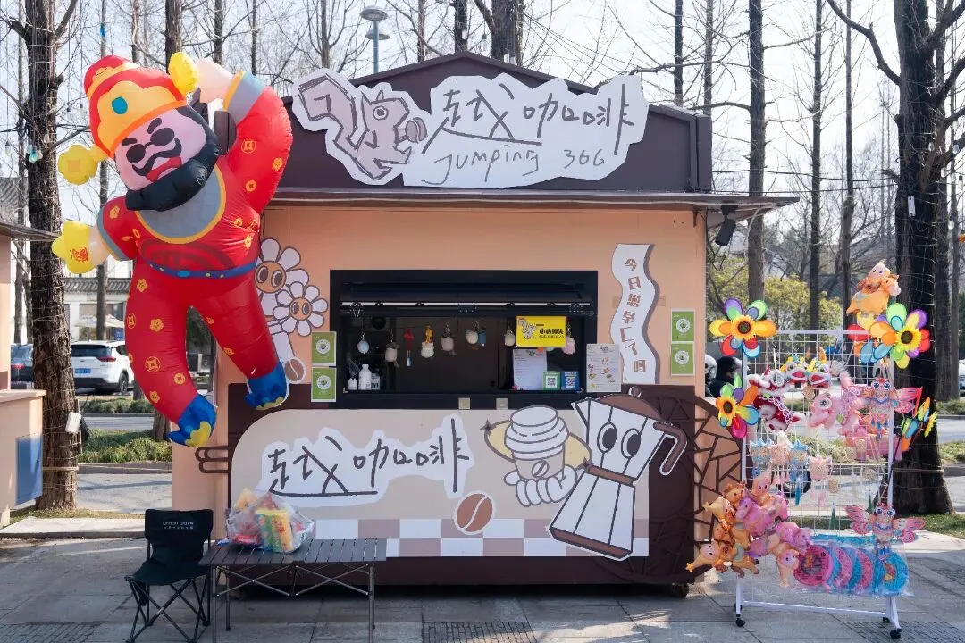 摊位的立柱上,红彤彤的福字错落点缀,还有憨态可掬的财神充气玩偶,眉眼间满是喜庆,各个摊位的布置把新春的氛围感直接拉满。