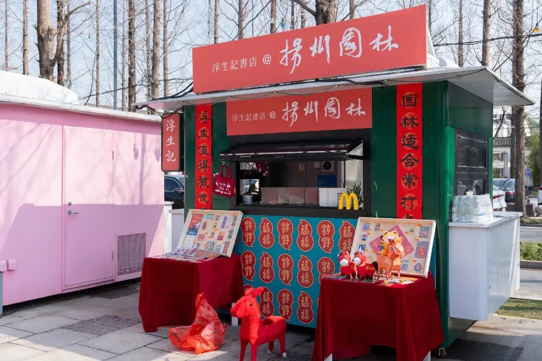 其中浮生记书店联名扬州园林,更是推出了各色各样的特色文创,小马玩偶、冰箱贴、文创包等等,每一件都承载着马年的吉祥寓意。