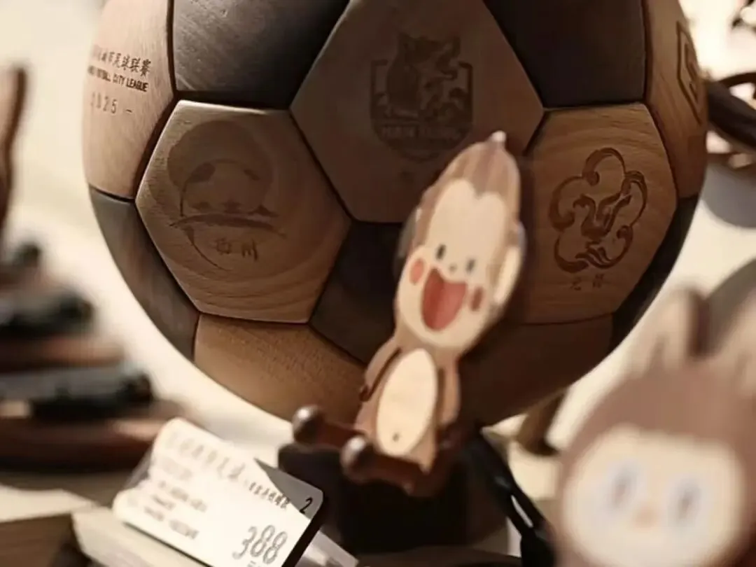 木头搭配时下最时髦的潮流元素图案,被雕刻成钥匙扣、摆件、挂件等手工品,十分招游客喜欢。现场更有“苏超”元素的木头足球。