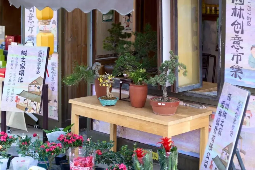 扬州的盆景更是数一数二,市集现场还展出了迎春花、兰花等盆景,造型雅致、意蕴悠长,将扬州园林的精巧与雅致展现得淋漓尽致,不少喜爱园艺的游客驻足观赏,细细品味这份独属于扬州的园林韵味。