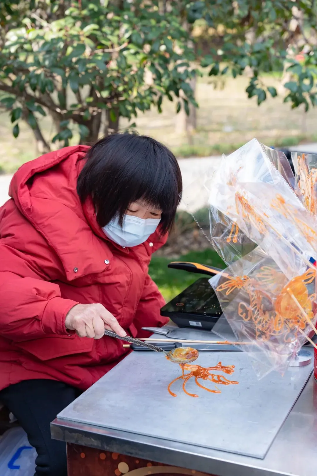 糖画摊位前,早已围得水泄不通,艺人手腕轻转、指尖微动,勺子起落间,金黄的糖浆如行云流水般流淌,转瞬之间,一匹奔腾的小马便跃然石板之上,晶莹剔透、形态逼真。