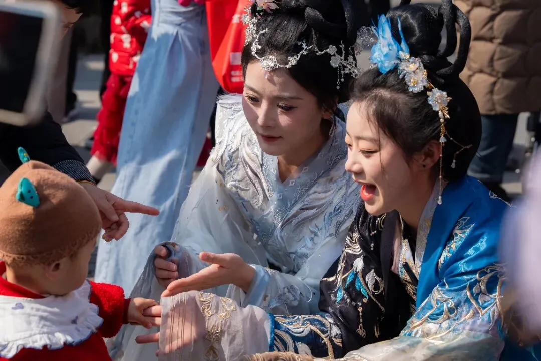 上午11点刚过,白塔脚下就响起了清脆的锣鼓声,身着复原古装、年味服饰的NPC演员们如约登场,手持宫灯、红灯笼,衣袂翩跹间尽是古韵风华,一出场就吸引了全场游客的目光,手机快门声此起彼伏。