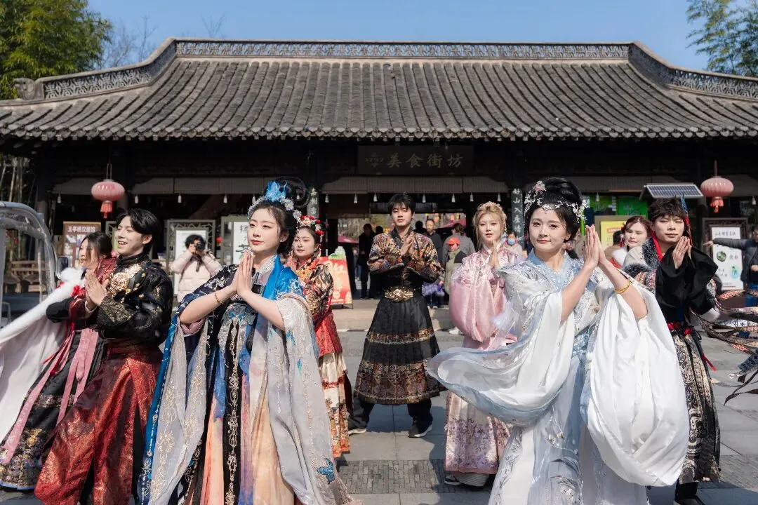 NPC们热情地向身边的游客发出邀请,不少家长牵着孩子,还有身着汉服的年轻人,纷纷加入巡游队伍。