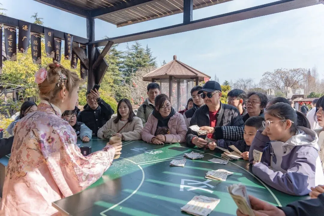 身着古装的NPC会念出经典名场面台词,邀请游客对答,答对的游客还能收到专属新春祝福。NPC们还会带领大家玩趣味小游戏,钱庄、银票等老物件带你一秒穿越回古代市集,体验一把古人休闲娱乐的乐趣。