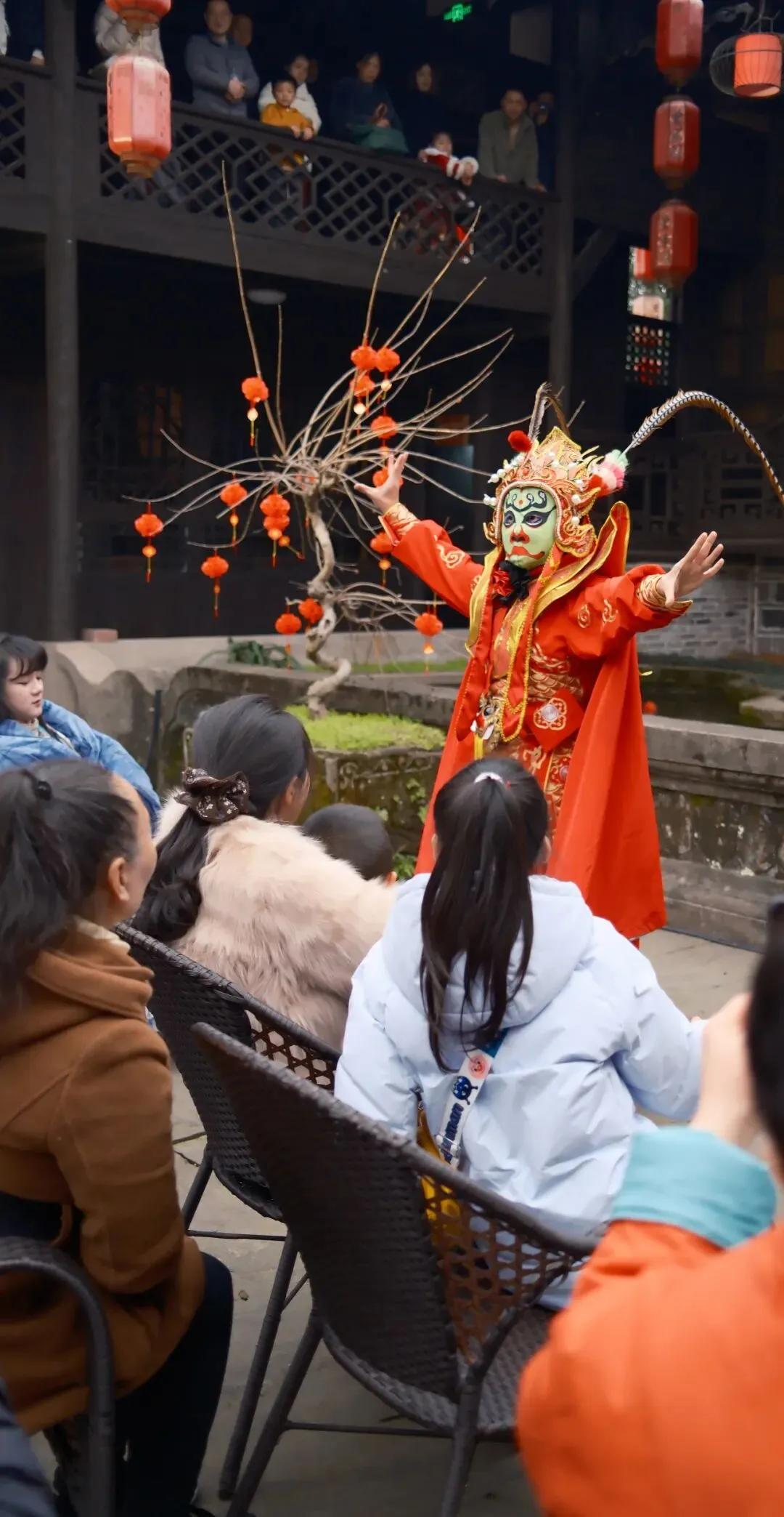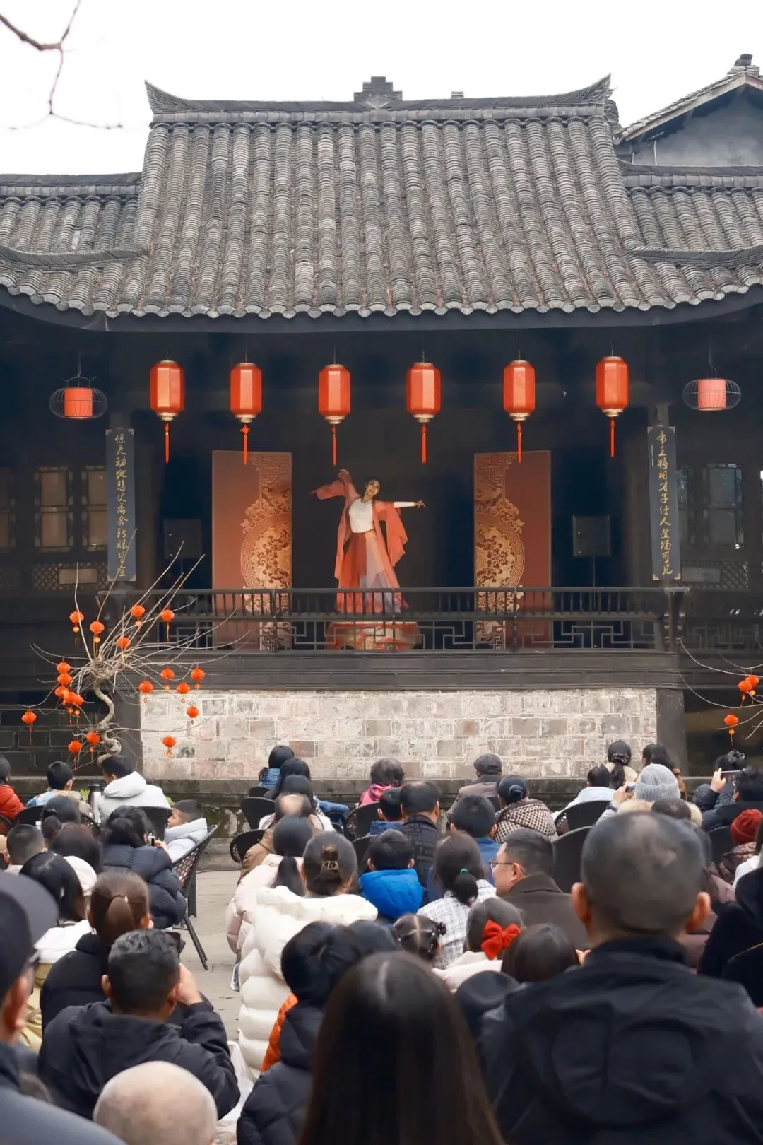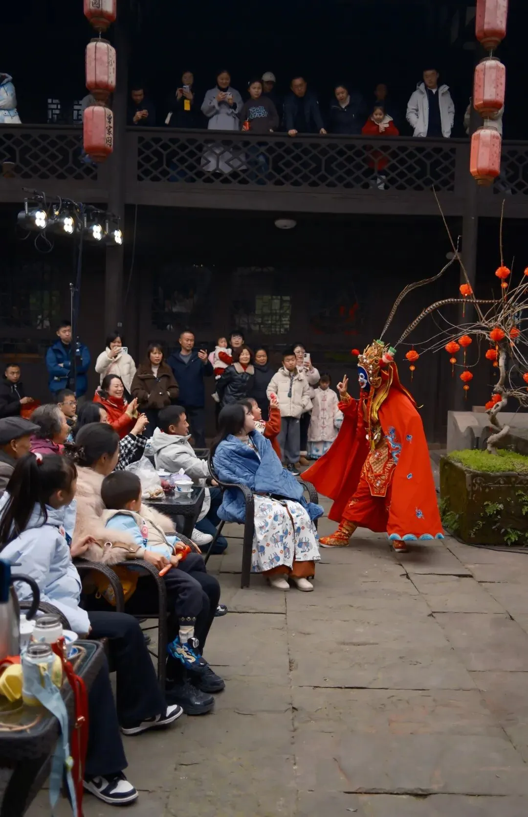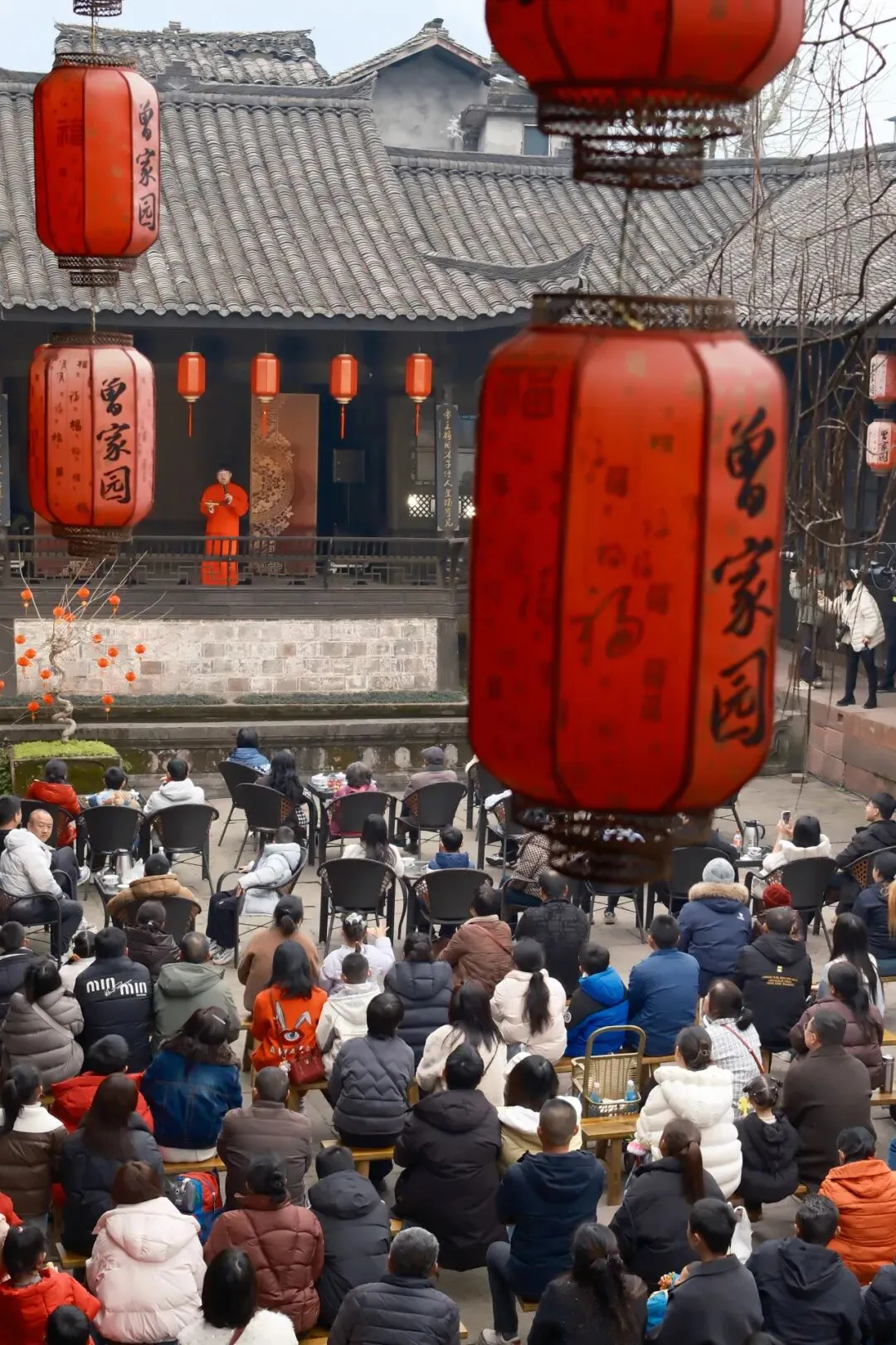 14:30,曾家戏楼座无虚席。激昂鼓舞、生动评书、典雅戏曲水秀、风趣脱口秀、惊险变脸喷火、飘逸长嘴壶茶艺……将在雕梁画栋间轮番上演。于悠悠唱腔中,邂逅旧时川西的雅韵风情,触摸时光沉淀下的文化温度。