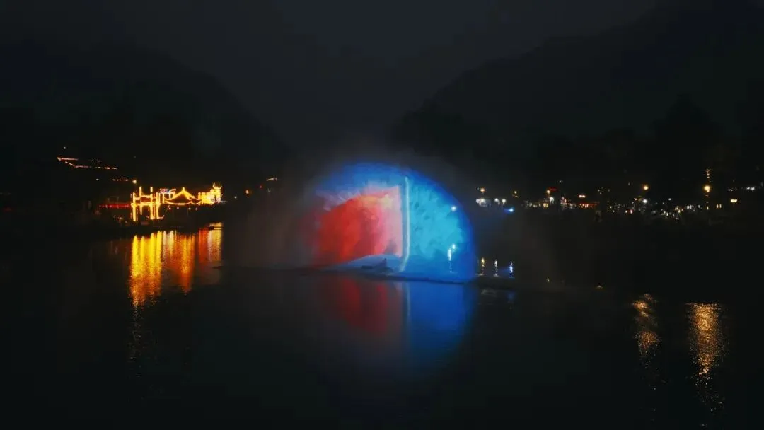 科技与自然结合,光影与水幕共舞。一场声光电的视听奇迹,在江面上展开奇幻画卷。
