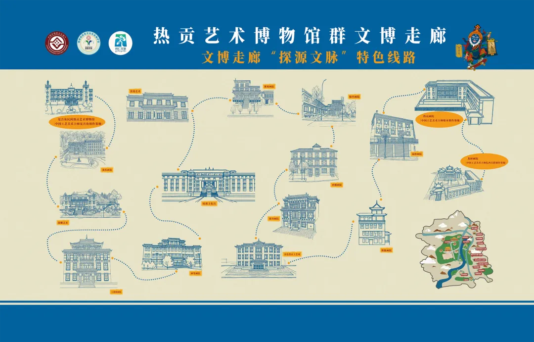 热贡艺术博物馆群文博走廊有效串起热贡艺术民间博物馆(仁俊院)、国家级文化产业示范基地、国家级非物质文化遗产生产性保护示范基地(热贡画苑)、国家AAA景区+综合画院(龙树画苑)等规模性、标准性画院25家,探索设计“探源文脉·文博走廊”特色线路,形成了“一院一格”文博走廊体验系统。