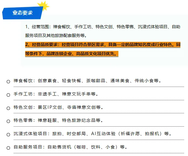 狼山的改变并非心血来潮 早在25年8月份的时候 南通狼山旅游度假区微信公众号 就曾发布狼山那山道房屋业态招商预公告 明确表示计划引入 禅食餐饮、手作工坊、特色文创、特色零售 沉浸式体验项目、自助服务项目 及其他旅游配套服务 25年11月的时候又追加经营品质要求 提出经营项目符合景区需求: 具备一定的品牌知名度或行业特色 同等条件下 品牌连锁企业、高品质文化项目优先