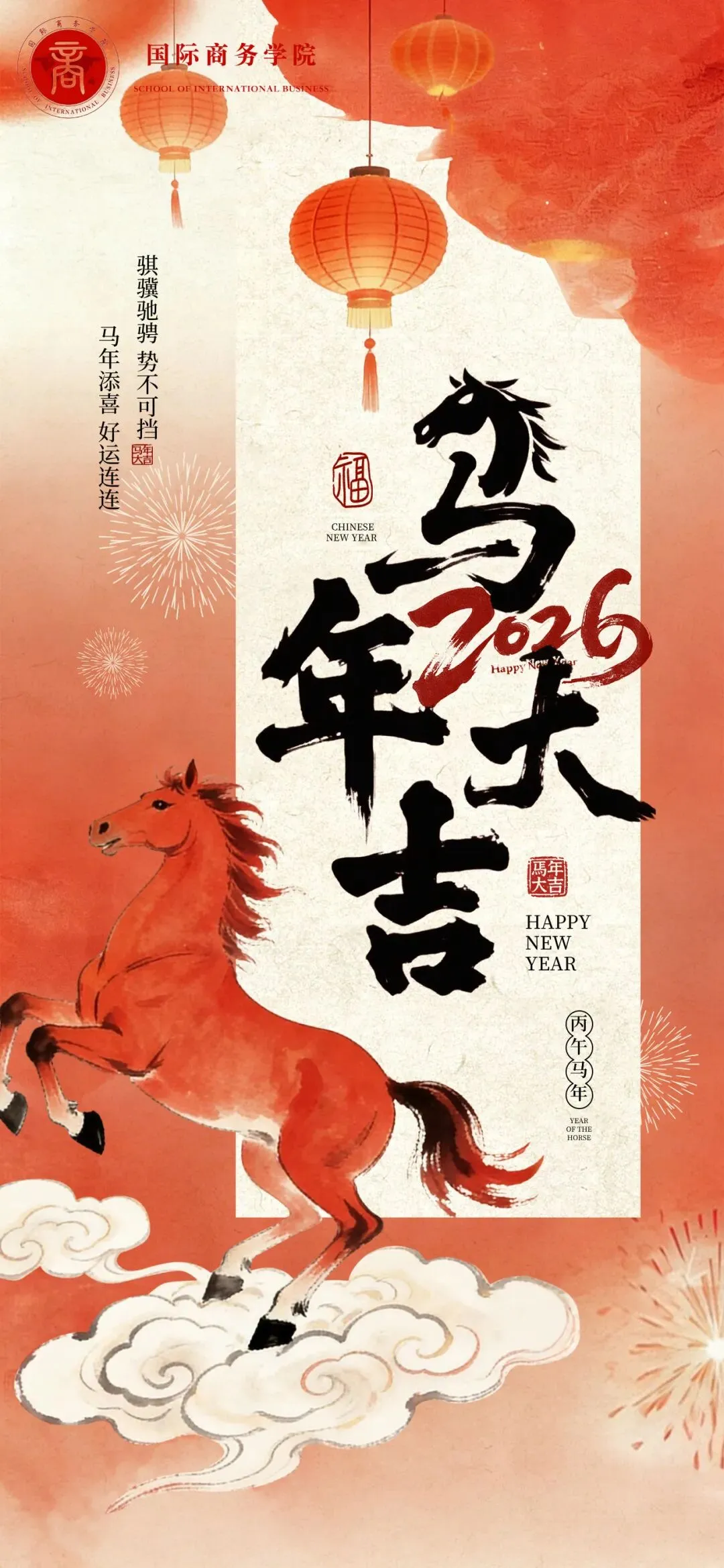 春潮涌动,万物启新。当2026年的春风拂过五洲,丙午马年的蹄声已然铿锵踏响。值此新春佳节,国际商务学院向心系学院发展的全体同仁,致以最诚挚的新春祝福!
