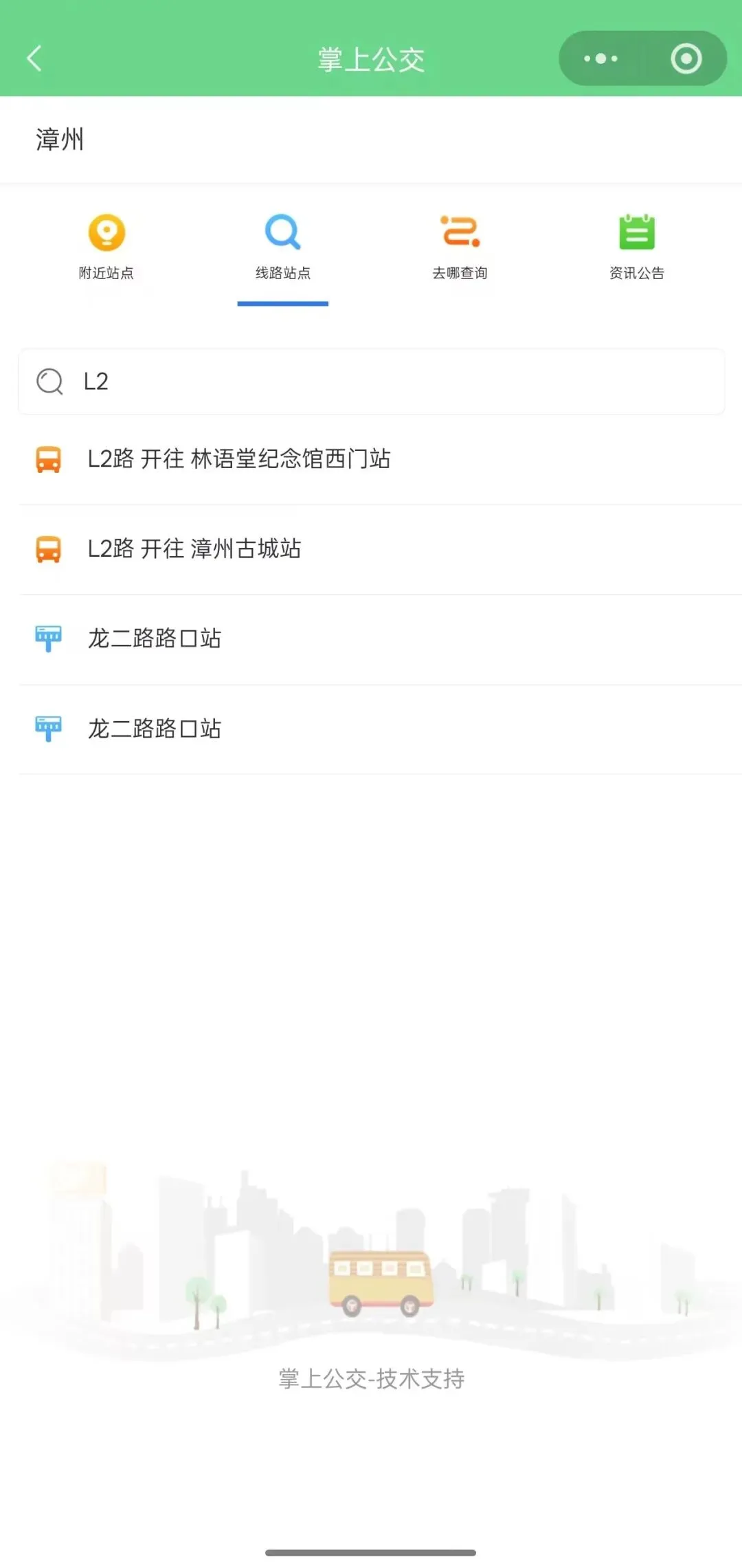 点击“公交查询”模块,然后点击“线路站点”输入“L2”,点击L2路,即可查看线路完整走向、所有停靠站点。