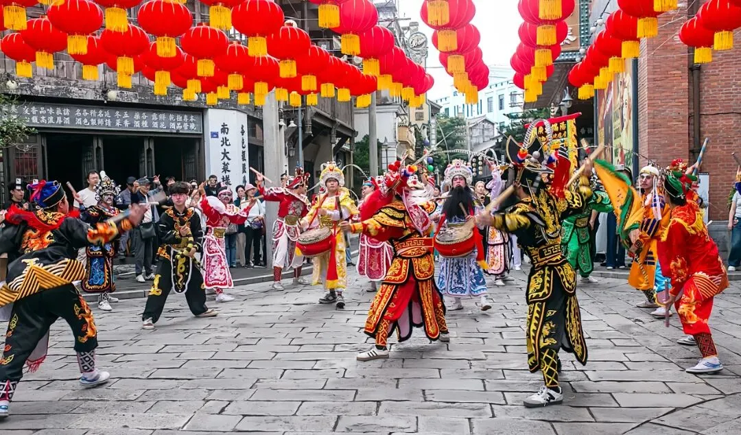 而钟楼美术馆外,是另一种沸腾。来自潮汕的国家级非遗揭阳潮义英歌队身着彩衣、脸绘脸谱,以雷霆万钧之势拉开“电影公社里的中国年”大巡游。鼓点如骤雨,舞步似旋风,醒狮、腰鼓、骏马方阵紧随其后,所到之处游客层层围拢。来自杭州的游客李先生带着孩子刚学完英歌舞基本步法,满头大汗却难掩兴奋:“以前只在短视频里看过,今天在公社和英歌队员击掌互动,孩子说这是最酷的中国年!”
