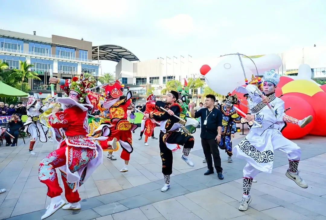 如果说电影公社的年俗古韵是一幅铺陈开来的水墨长卷,那么观澜湖新城便是一卷流光溢彩的时尚画报。大红灯笼与光影艺术装置交相辉映,运动奥莱店里手提购物袋的游人络绎不绝,文创手作摊位前大家精心挑选着心仪的新年礼物。午后,潮汕布马舞跃动登场,将古战场的英姿与新春的喜气一同呈现在游人眼前。不远处,清脆的竹竿敲击声清脆响起,黎族竹竿舞热情开跳,在开开合合的节奏间,大人小孩手拉手跃入跳出,欢笑声洒满一地。