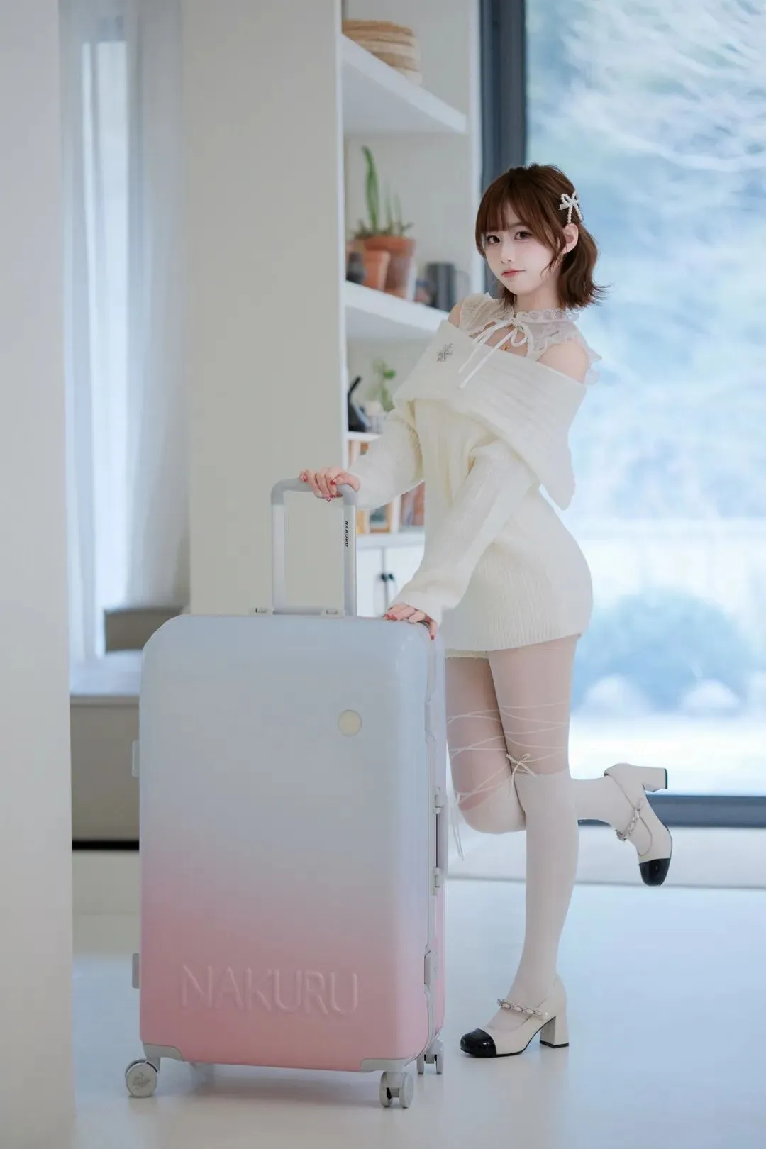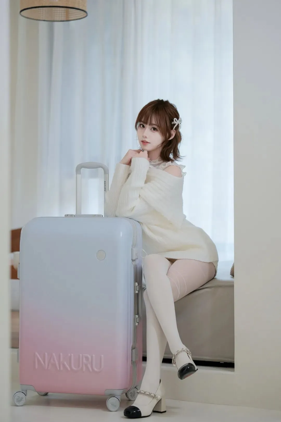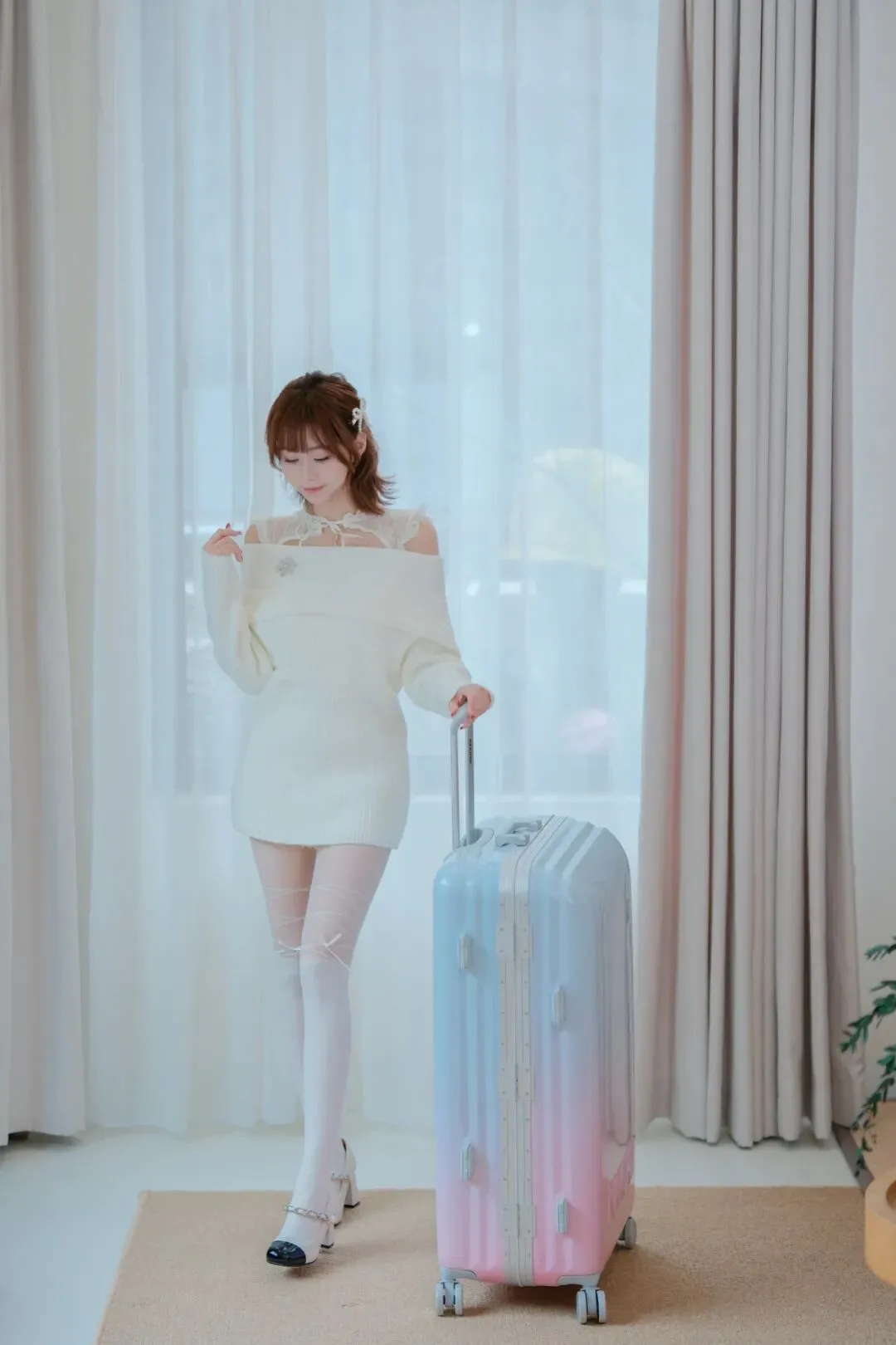 8.惬意走起来低头看 抓拍全身 人物轻握行李箱把手作互动,另手轻拨衣摆添柔感,借轻透帘幕衬出松弛氛围。这种“道具联动+细节小互动”的姿势,不用硬凹体态,松弛间自带甜酷格调,肢体摆置自然,让画面既灵动又显精致