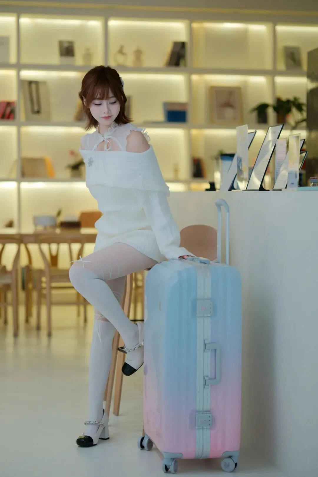 7.惬意慵懒坐着翘腿 低头看 人物轻靠行李箱作支撑,单腿搭置添灵动感,借室内布景衬出松弛氛围。这种“道具作依托+肢体轻摆置”的姿势,不用硬凹体态,松弛间自带甜酷格调,肢体互动自然,让画面既生动又显精致