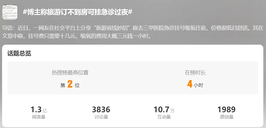 图源:某社交平台截图 帖子中还特别强调:「一定要去大医院(三甲医院之类的),大家能懂吧!!!大医院就是五星级酒店!他们有贴心服务和舒服的躺椅!」 此举立刻引发广大网友的热烈讨论, #博主称旅游订不到房可挂急诊过夜# 话题甚至直接冲上了微博热搜,实时排行榜最高第 2 名。