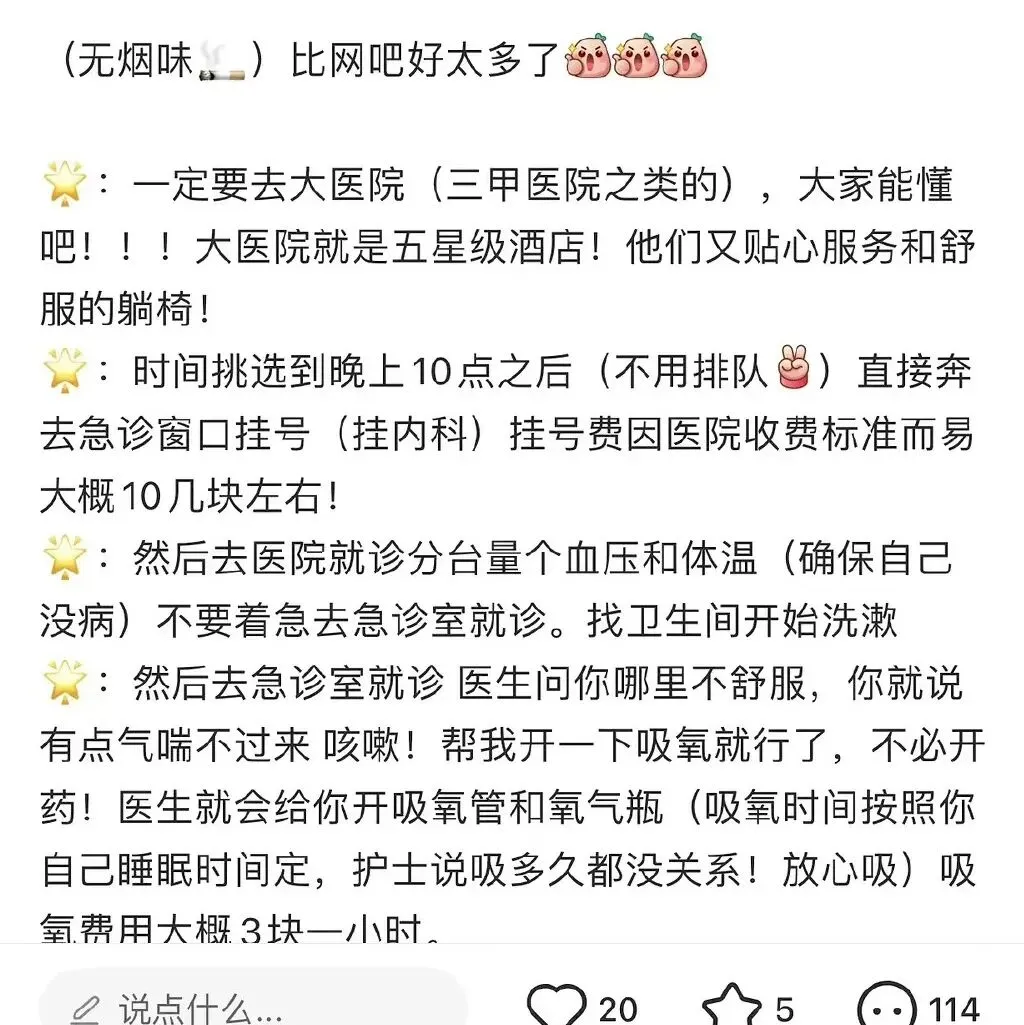 甚至也有人开玩笑道:「病人没有查出疾病,医生也不存在沟通压力,不挺好的吗?」——从蹭住的患者角度看,TA 获得了免费或低价的资源;从医生的角度看,他们度过了平安的一夜;医院也不会受到投诉和损失。 可这真的看上去是「三全其美」吗? 在帖子原文中,有一个特别值得注意的点,那就是博主特别强调一定要去三甲医院:不仅环境舒适「堪比五星级酒店」、「无烟味」、有「贴心服务和舒服躺椅」,还有「护士替你看管行李」。 这种类比错误地将医院与酒店、网吧进行归类为普通的公共场所,将霸占医疗资源的行为解释为合理的消费手段。不仅占用医疗资源、还为其美化,显然是自私的。 试想一下,当这种行为成为潮流,「三全」之下到底是谁难得保全?是面对疾病认真诊治的医生,是真正需要抢救的急诊患者,也是贯彻为群众服务的医院。 有些钱不该省,有些玩笑也不该开。请把医院的病床,还给真正的患者。 策划:ame | 监制:gyouza 👇 丁香园社区站友正在热议中,点击「阅读原文」查看并参与讨论