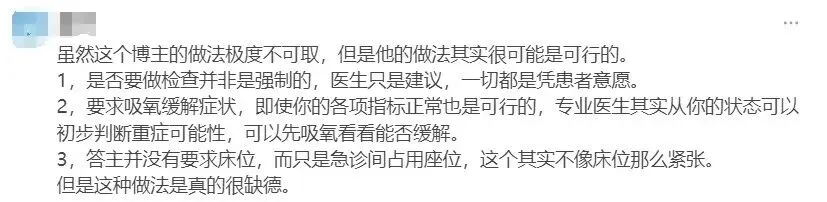 图源:知乎 其次,任何关于诊疗的行为都要按照指证或是诊疗规范处理。针对帖子中「开吸氧管和氧气瓶」的行为,有医生评价道:「想吸氧就得有低氧血症……指氧仪几秒钟就给你测出来了。如果没有低氧血症不可能让你吸氧的,骗不了医生的。」 再者,在诊断明确之前,为了防止一些突发情况,通常要进行一段时间的留观;而一旦诊断明确,医生便会给予一定的处理方案;若患者暂无大碍,也会劝说患者离开——毕竟,急诊人员混杂,也存在一定的感染风险。 更有不少有过急诊就诊经历的网友表示:「急诊人员环境复杂,抢救声、人声不断,这种环境是怎么睡得着觉的?」 这种靠「装病」换取在医院急诊的低价留宿的想法,似乎从哪一种角度讲都并不现实。不仅还容易「得不偿失」,更是将是将医生的诊疗准则视为儿戏。 拿医院当免费酒店?别再浪费医疗资源 目前,某社交平台上已经无法检索出推文原帖。但显然的是,这场装病蹭住的行为已然激起网友们的深恶痛绝。不过也有人认为,这种行为看似「缺德」,实则可行。