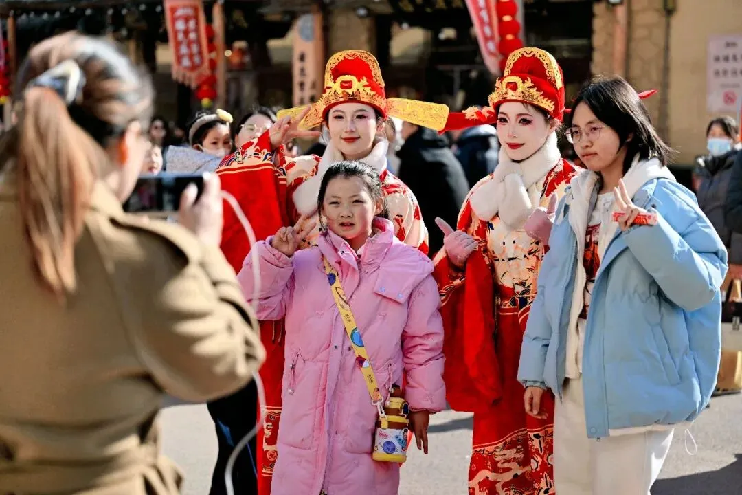 游客争相与景区内NPC合影留念。