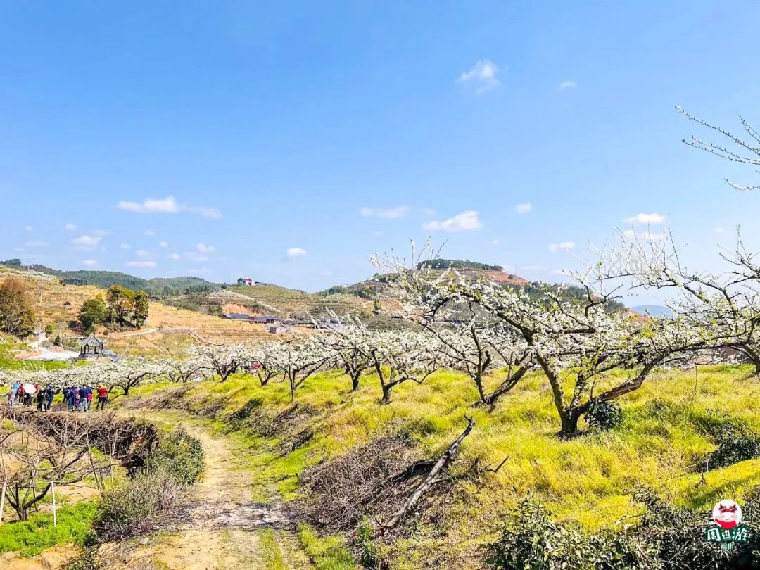 远远望去,遍野的李花好似一片片白云坠落人间,又像是一座座小小的雪丘连绵无边。