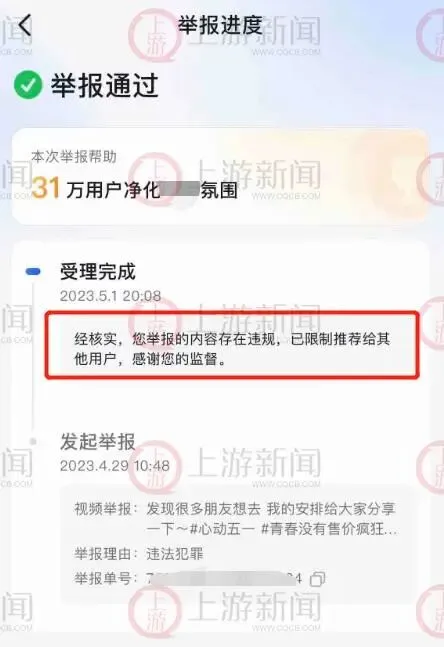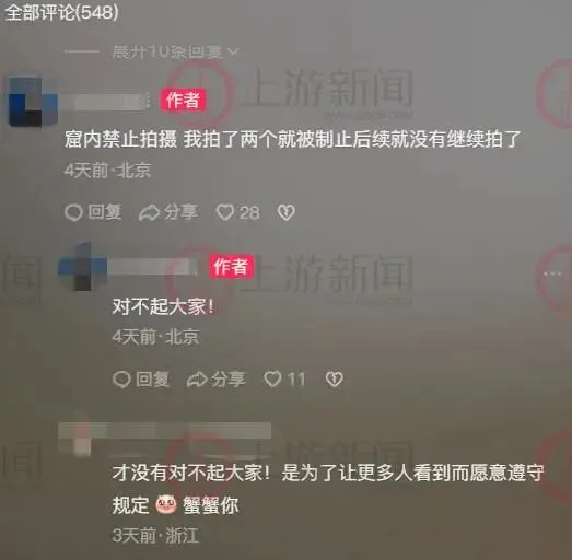 涉事视频社交媒体截图。 5月2日上午,上游新闻记者在被举报的旅游博主个人主页看到,有三个关于敦煌之行介绍的短视频,其中“敦煌之行(二)”视频的43秒到45秒疑似窟内拍摄画面。 网友“天涯”告诉记者:“这名博主目前虽然没有将窟内拍摄的视频下架,但是播放量上万,第三方视频平台已核实举报内容后对其做限流处理。” 上游新闻记者从网友“天涯”展示的举报受理凭证截图看到,平台受理完成回复“经核实,举报的内容存在违规,已限制推荐给其他用户。” 举报受理页面截图。 网友“天涯”告诉上游新闻记者:“他的拍摄角度明显就是躲在人群后面,在大家背后偷偷录制。我通过私信告诉这名博主把偷拍的内容删了,不然让大家举报他,这名博主就把我拉黑了。” 在视频评论区,网友就有关窟内禁止拍摄的话题展开热议。有网友很气愤,“说了无数遍洞窟内禁止拍照 ,你怎么还拍。”也有网友质疑其博流量,“窟内不能拍照,对文物有损害,工作人员全部说明了的,博主为了红太没底线了吧。” 对于网友的热议和质疑,当事旅游博主的回应态度也慢慢发生转变,最初他曾表示:“如果我站在100米外,拉15倍拍照会有损害吗”“你的话真多。”后来他回复道:“窟内禁止拍摄,我拍了两个就被制止,后续就没有继续拍了”“我错了”“对不起大家!” 随后,上游新闻记者通过个人主页私信功能联系该旅游博主,截至发稿前没有回复。 博主态度发生改变。 5月2日,记者以游客身份联系莫高窟景区石窟讲解科反映情况,在听完情况描述后,接电话的工作人员回应:“我们将加强安保巡查力度,并调查该旅游博主的视频内容。按照《莫高窟文物保护管理条例》,未经申请,在洞窟内拍摄一律是不允许的。如果(情节)严重的话,他也会触犯法律,我们会跟公安机关交涉。” 对于莫高窟内游览的规定,上述工作人员表示:“窟区的外景游客可以拍照录像等,但是在洞窟里,无论是打冷光或者不开闪光灯拍照录像,目前都不允许。” 长期以来,外界多数认为“禁止拍照”是为了防止闪光灯强光对壁画产生化学反应,造成加速氧化分散,从而导致壁画脱色、损坏;另外,一些声音则称,敦煌莫高窟是中国文化瑰宝,不能轻易外传。 对此,时任敦煌研究院常务副院长的王旭东曾告诉中新社记者说,石窟内空间狭小,每天游客众多,拍照停留可能会造成秩序混乱的状况。同时,游客长时间停留在洞窟内产生大量二氧化碳,湿度和温度变化会加剧石窟“衰退”,颜料颗粒溶解致使壁画画面脱落,“大多数游客能理解我们采取的措施,目前莫高窟仍然禁止拍照录像。”