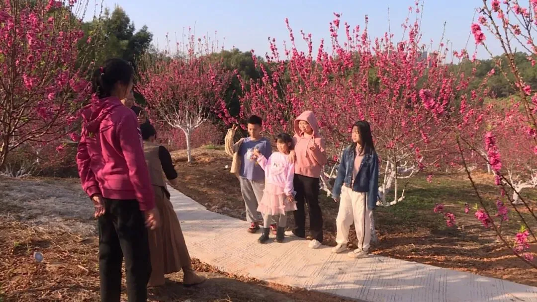 风和日丽,春意盎然。景区内连片桃花枝头怒放,粉艳如云、灿若朝霞,与青山绿树、亭台步道相映成趣,绘就一幅醉人的春日画卷。游客漫步花间步道,驻足留影、结伴赏景;孩童嬉戏奔跑,欢声笑语不断,处处洋溢着喜庆祥和的节日氛围。
