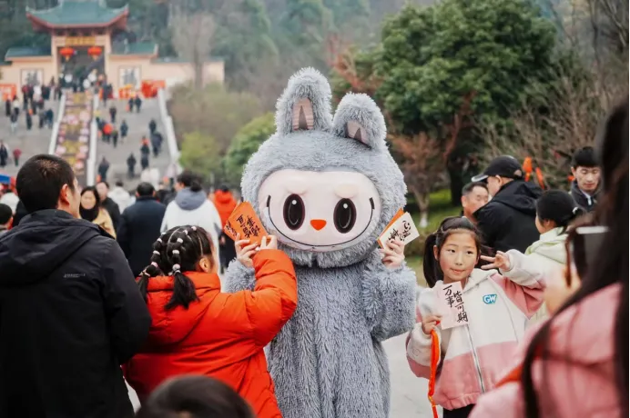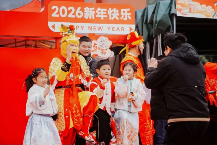 庙会设置多处沉浸式互动点位,提升参与感与趣味性。“步步生莲”区域内,财神、文曲星等NPC现场互动,答对传统小问题即可领取新春礼品;呆萌玩偶巡游全场,与小朋友互动合影、派发小礼物,“暴富上上签”等马年主题打卡点自带传播热度,助力游客轻松拍出新春氛围感大片。