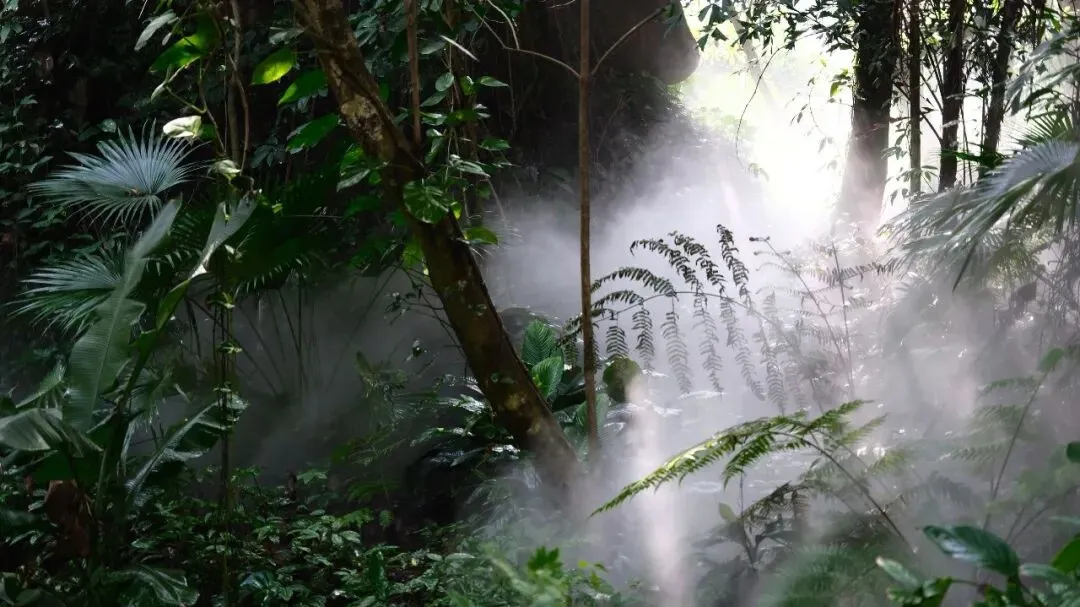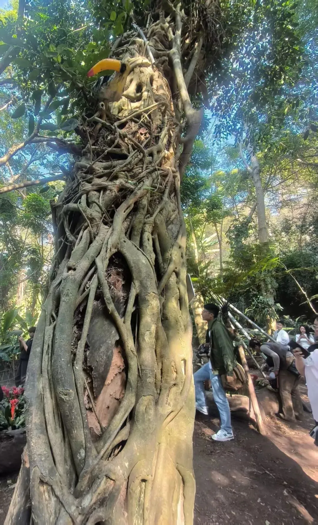 热带雨林区每日上午9:30-11:30、下午14:30-17:00开放雾森系统,营造云雾缭绕的仙境效果,在这里,呼吸里藏着山海的私语——树是凝固的浪涛,风是游走的诗行。水珠顺着王莲叶片滚落的轨迹,像极了银河坠入人间形成的微型瀑布群。其中有一棵”绞杀榕“让我们大开眼界,鸟儿吃到了榕树的种子后,无意中将粪便排到了这棵树根上的土壤里。从附生幼苗到扎根大地,这些榕树不仅开始了自己的成长,还逐步攀缘、缠绕、挤压为宿主树带来窒息危机。而我们看到的那棵绞杀榕就把宿主给”窒息“死了,宿主大树被紧紧包裹在这棵“温柔缠绕”的榕树里。只知道动物世界里有弱肉强食,植物界里还有“绞杀博弈”。