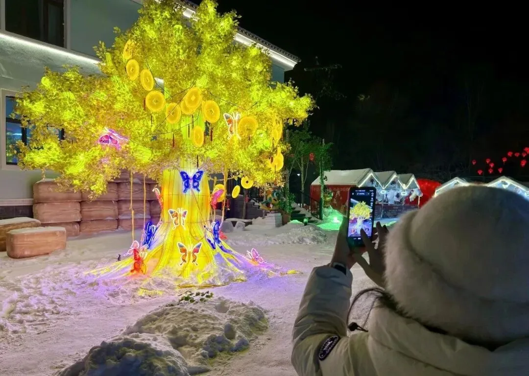 当夜幕降临,林海又换上了另一副璀璨容颜。松桦语境园内灯火璀璨、游人如织,伊春森工花灯展成为市民游客争相打卡的“网红地标”。皑皑白雪映衬下,各式花灯流光溢彩,猜灯谜、趣味游戏吸引着孩子们。从春节持续至元宵节,璀璨灯火为全市人民和八方来客送上最真挚的新春祝福。而在桃源湖景区,数百架无人机腾空而起,在夜空中变幻出生肖图腾等图案,游客的欢呼声久久回荡。