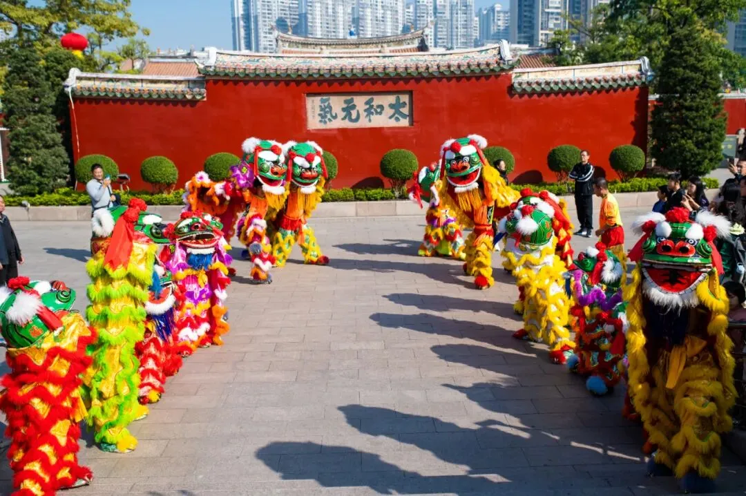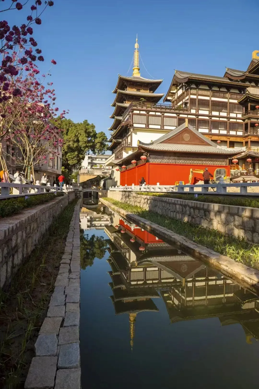 扩建修缮后的双峰寺焕新颜,水色天光与红墙金瓦相映,满是岭南水城的灵动诗意。