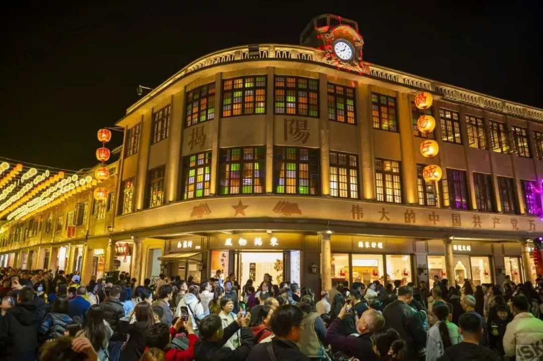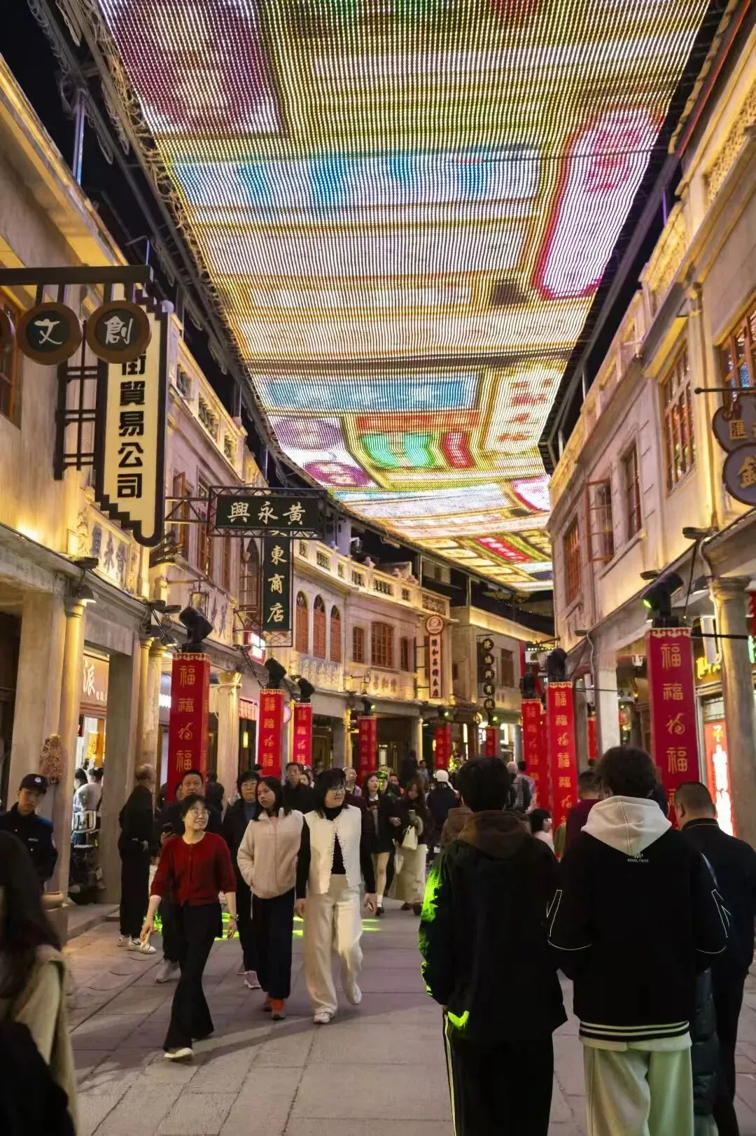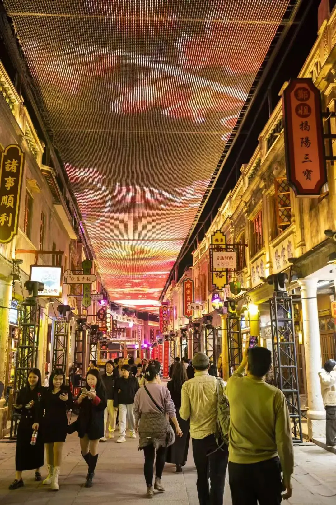 华灯璀璨,暖光铺满整条骑楼街,和天幕装置的流光交织出梦幻夜景,尽享揭阳古城的万千风华,吸引市民游客争相打卡。