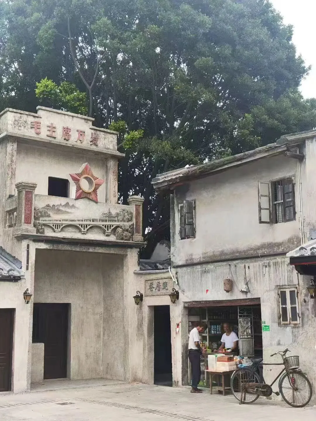 穿过新街桥,邂逅古城的“红色印记”打卡点。骑楼顶层的“毛主席万岁”标语,与下方五角星雕塑、桥梁山水浮雕相呼应,为古城增添一抹厚重的红色底蕴,吸引很多人来这里拍照打卡。