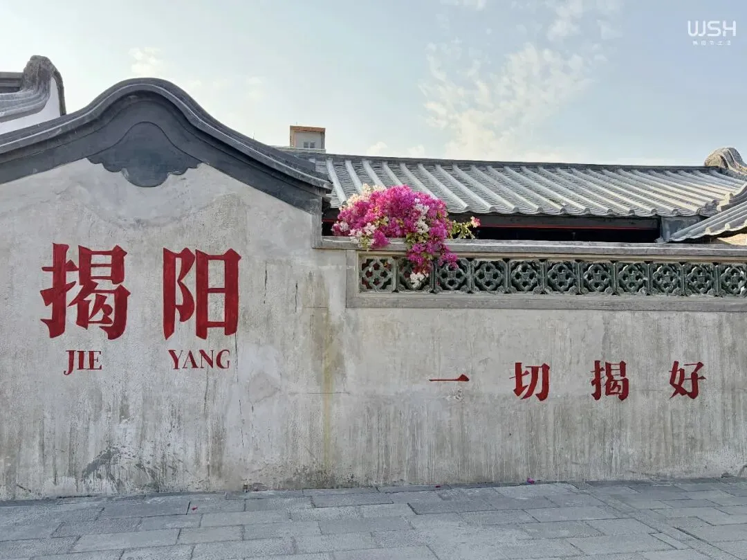 绍兴路附近的网红打卡墙,“揭阳”、“一切揭好”,红色字体格外醒目,搭配着探出墙头的三角梅,复古又治愈。