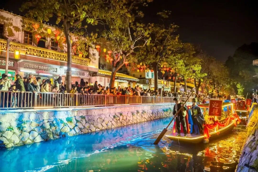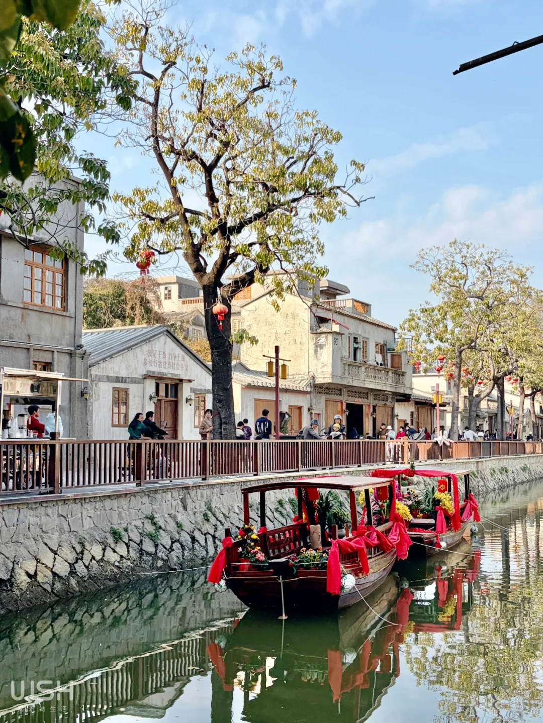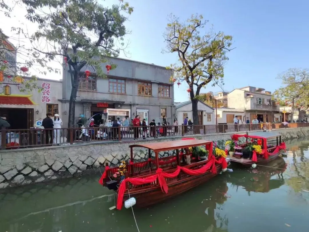 古城玉滘溪新添的游船项目,红绸画舫停泊在悠悠水面,与沿岸古建筑相映成趣,为古城添了几分岭南水乡的灵动诗意~