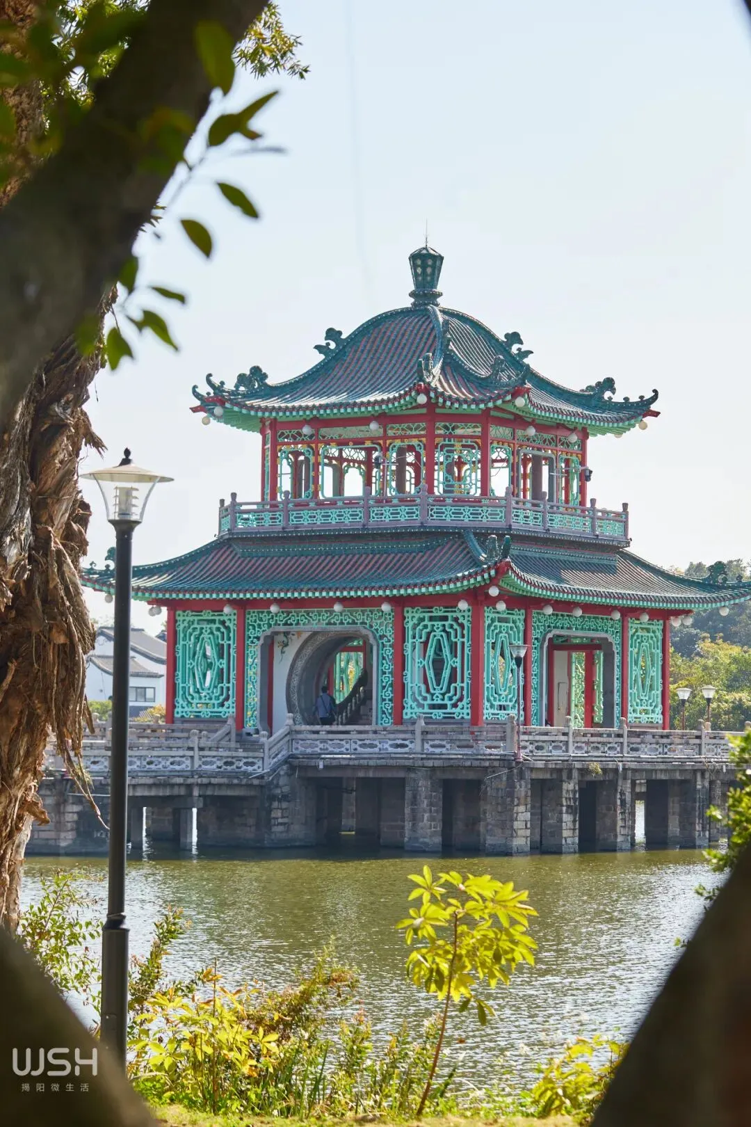 标志性的九曲桥如龙卧波,横跨湖面连接双层湖心亭,红柱绿瓦尽显江南园林雅致,环湖垂柳轻拂,与亭台倒影相映成画。